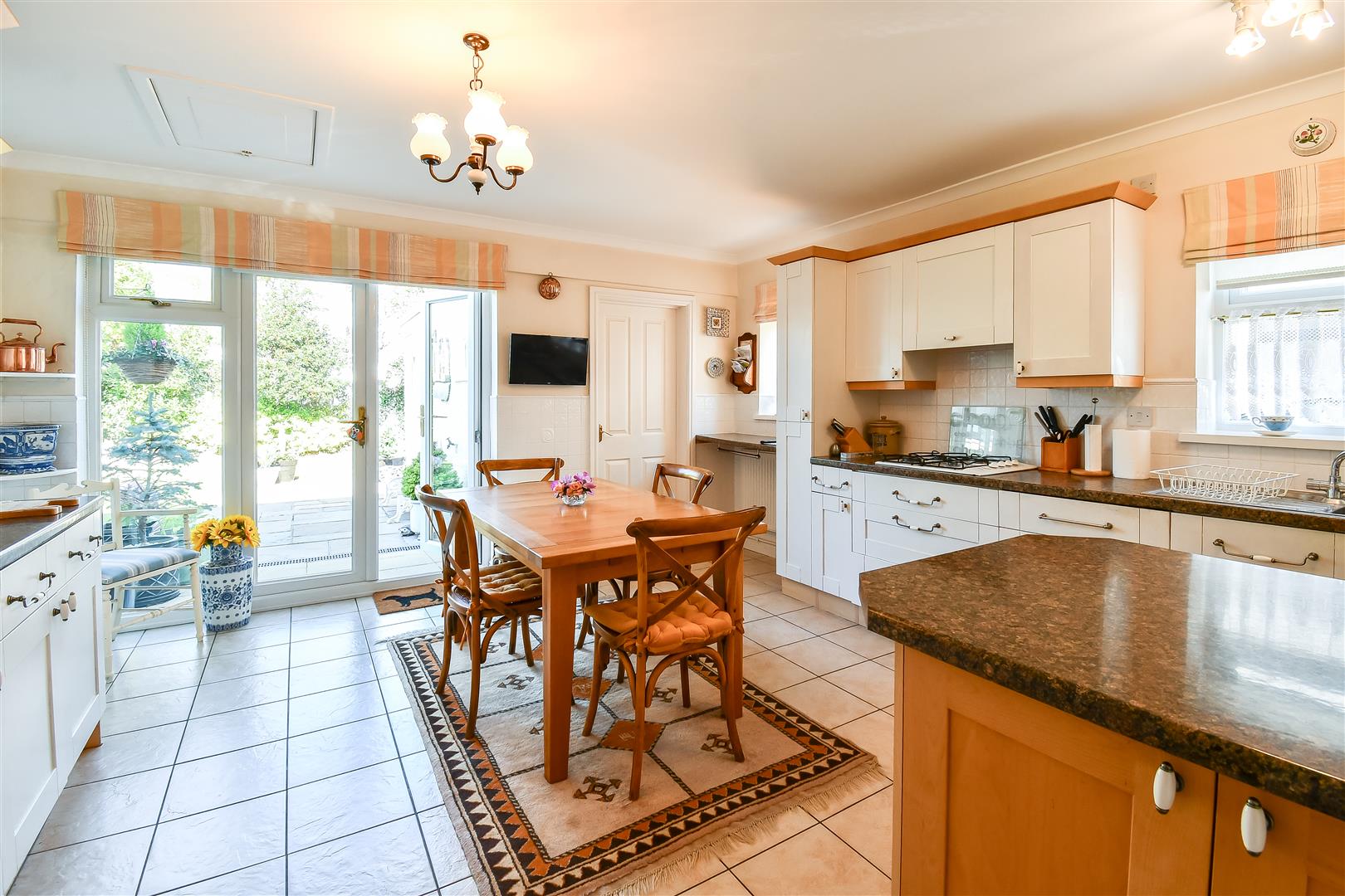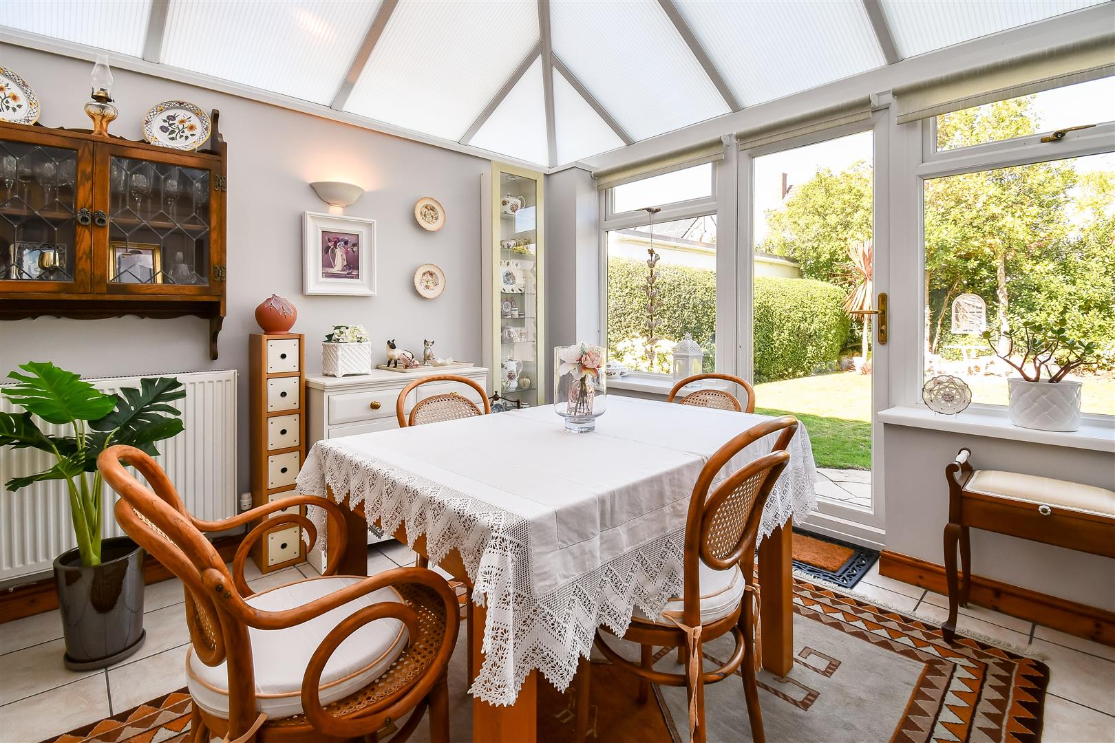 Polycarbonate roof, smoothly plastered walls. Ceramic tiled flooring. UPVC double glazed windows to the rear and side elevations. UPVC double glazed door leading through to the garden. UPVC double glazed French doors leading through to the dining / sitting room. Wood framed door with glass insert leading to the kitchen / breakfast.