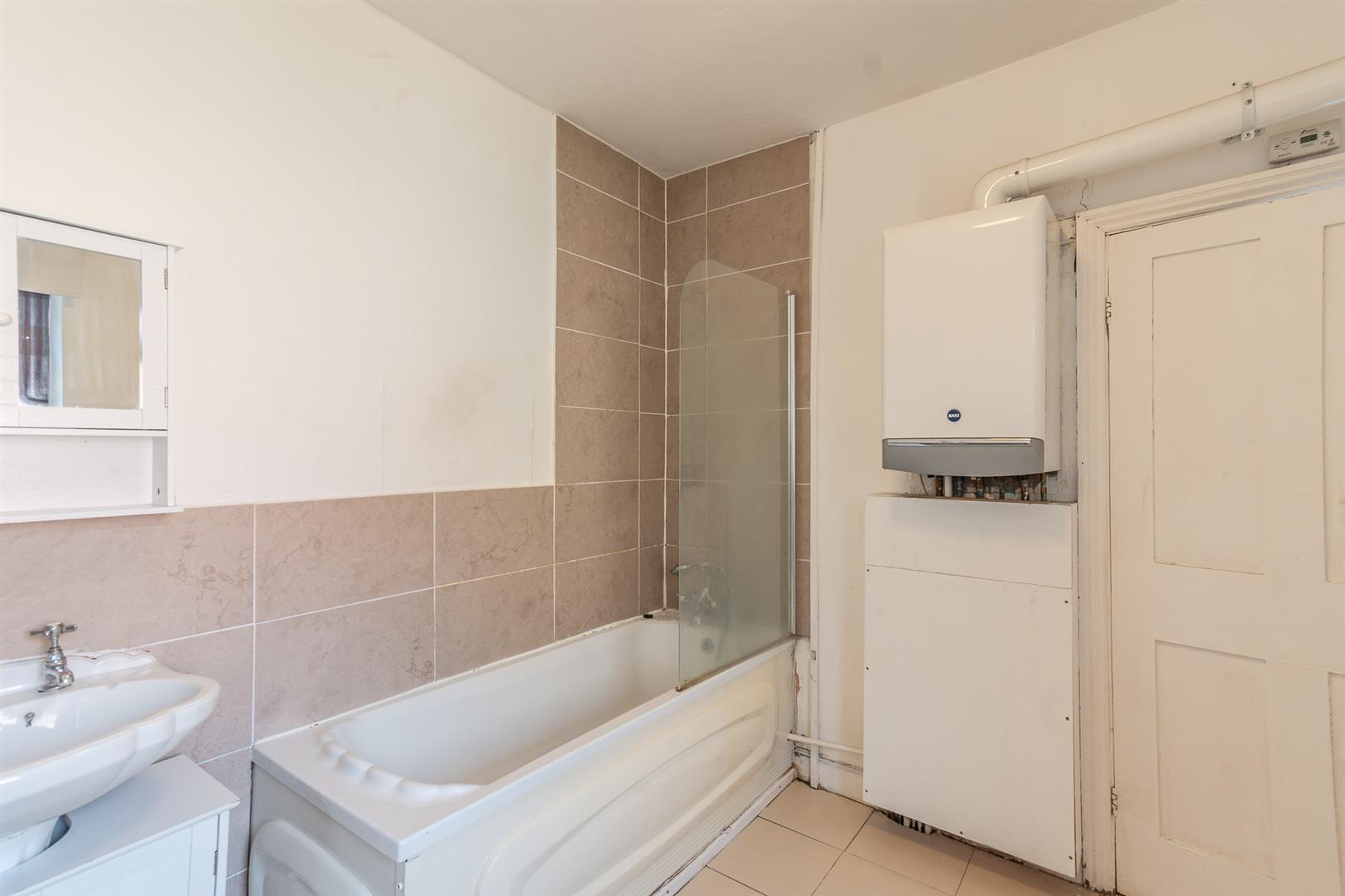 Plastered ceiling, papered walls, and tile flooring. It includes a bath with a mixer tap and shower attachment, a pedestal wash basin with mixer taps, and a close-coupled toilet. Heating is provided by a wall-mounted radiator and a vertical tower rail heater. The room also houses a wall-mounted Baxi combination boiler and has a UPVC double-glazed obscure glass window overlooking the rear aspect.