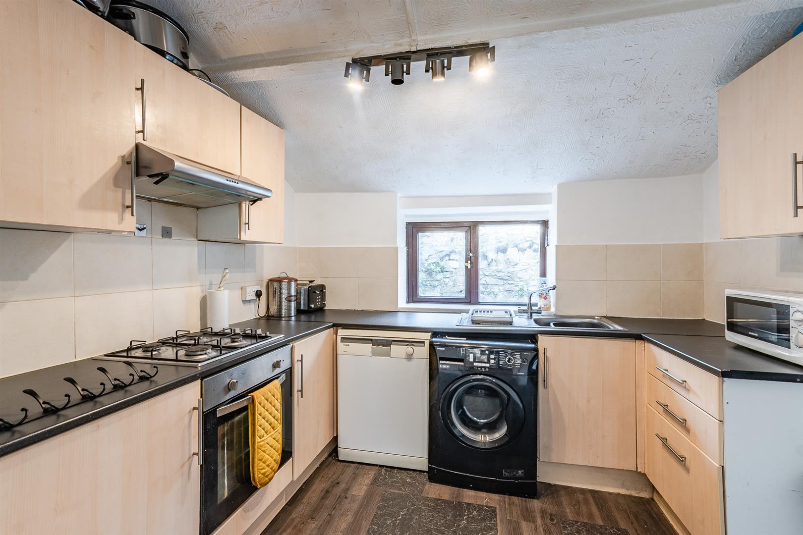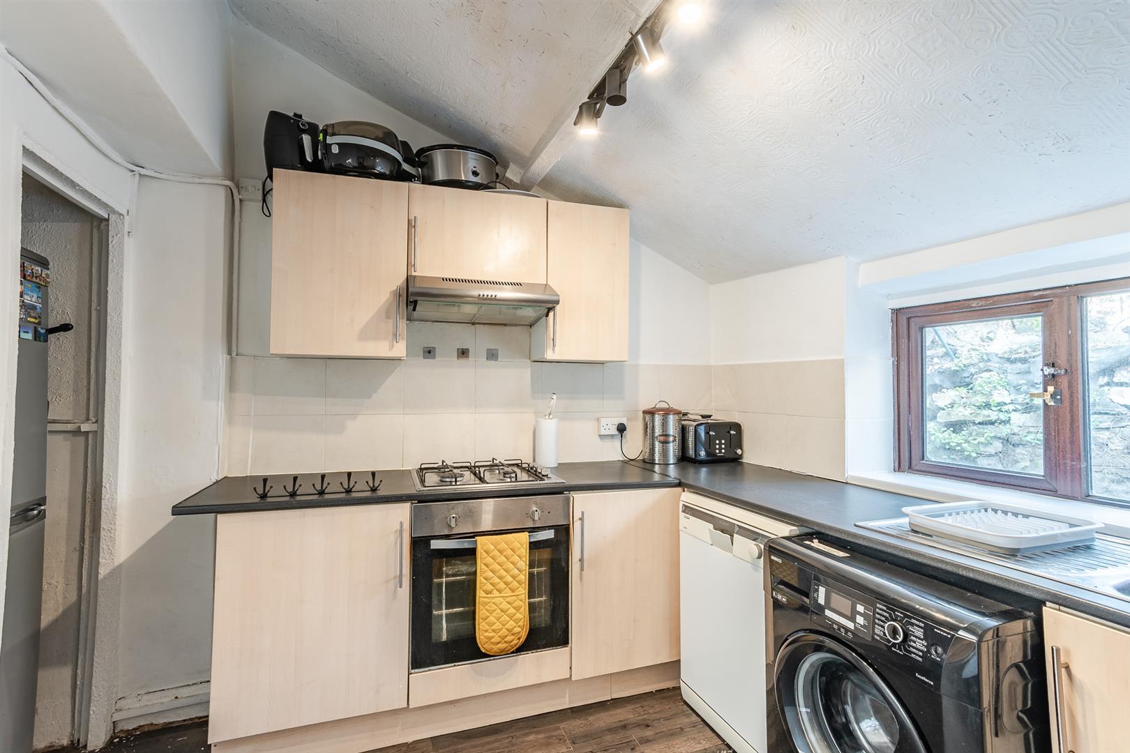 Sloping papered ceiling, plastered walls with tiles, and vinyl flooring. An under-stair storage cupboard houses a fridge freezer. The kitchen is fitted with high-level wall units, base units, and laminate work surfaces. Appliances include a fan-assisted electric oven, a four-ring gas hob set into the worktop with an extractor fan above, and plumbing for both a washing machine and a dishwasher. A UPVC double-glazed window looks out to the rear, and a further UPVC double-glazed door opens into the rear garden.