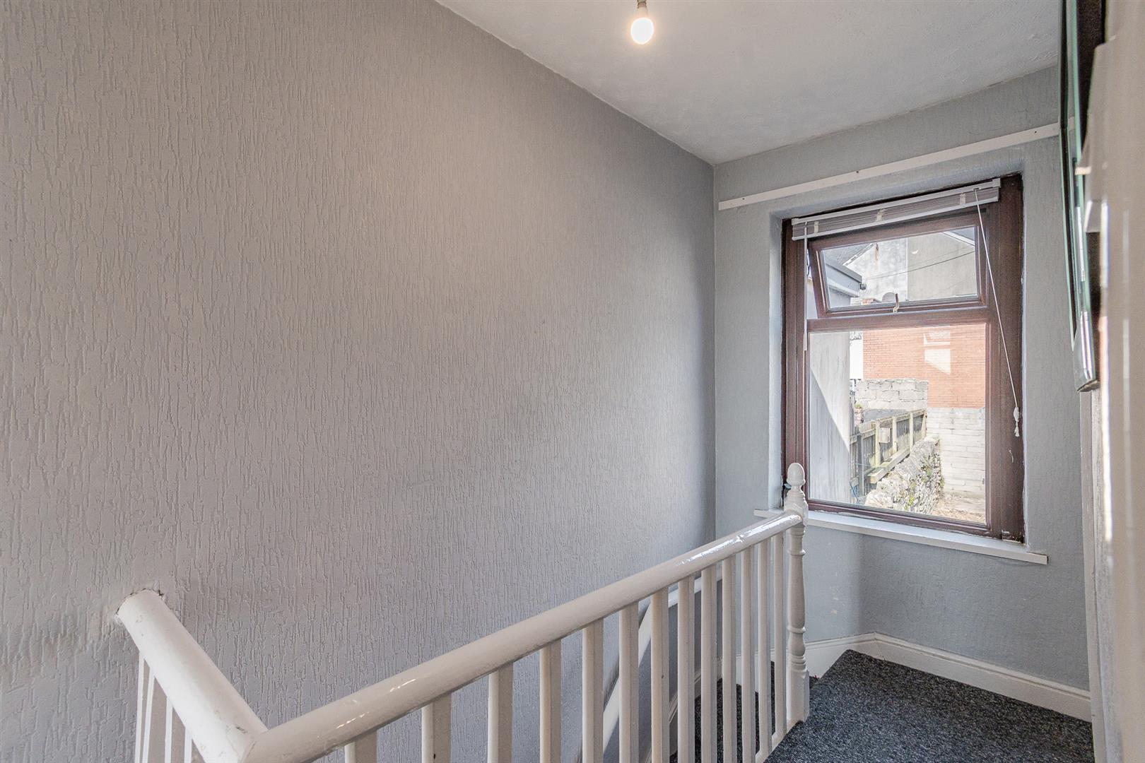 The first-floor landing features a textured ceiling, papered walls, and carpet flooring. It includes a UPVC double-glazed window overlooking the rear and provides access to the bedrooms and family bathroom via wooden doors.