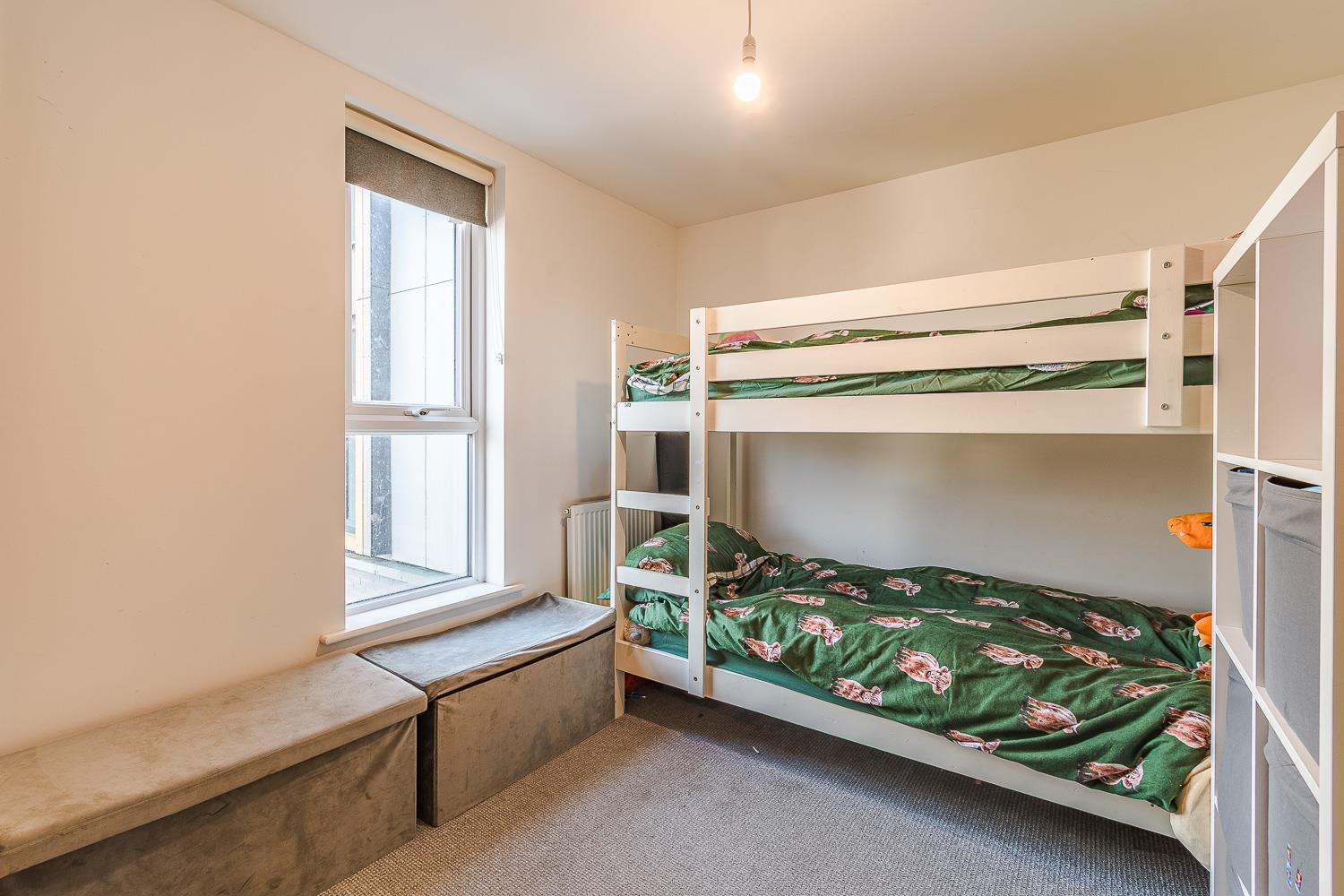 Smoothly plastered ceiling, Smoothly plastered walls. Wood laminate flooring. Wall mounted radiator. Wood panelled doors leading to Kitchen/living room, bedrooms one and two and the family bathroom. Access to storage cupboard.