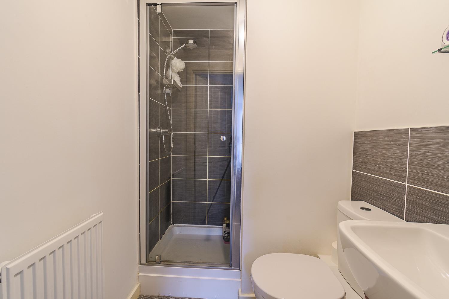 Smoothly plastered ceiling with vent extractor, smoothly plastered walls. Porcelain tiled splashbacks. Fitted carpet flooring. Wall mounted radiator. Shower with thermostatically controlled shower overhead. Pedestal wash hand basin. Close coupled toilet.