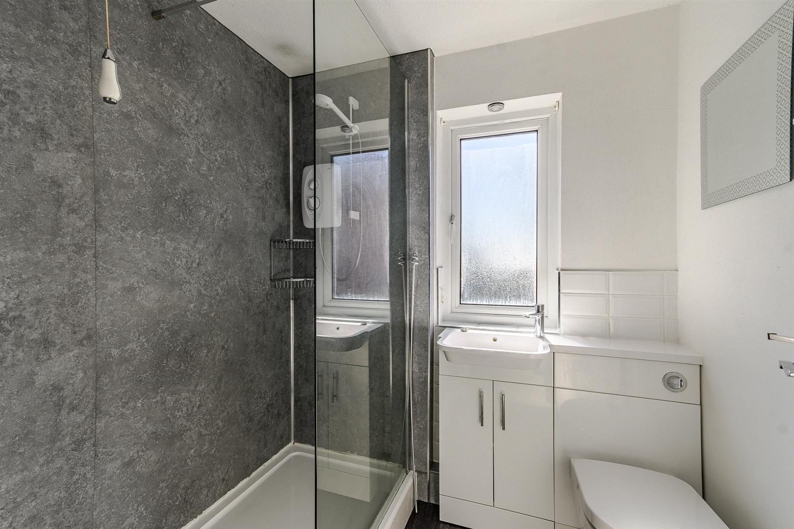 Textured ceiling, plastered walls, and vinyl wood-effect flooring. A UPVC double-glazed obscure glass window overlooks the front aspect. It also includes a storage cupboard housing the hot water tank. The shower room is comprised of a double walk-in shower cubicle with a glass screen, aqua panelling, and an electric shower. It also includes a vanity wash hand basin and toilet with storage and a mixer tap, along with an electric heater.