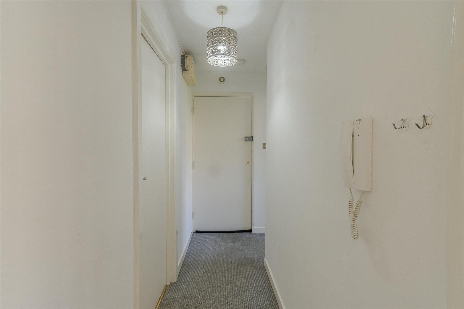 The entrance hallway features a textured ceiling, plastered walls, and loft access. It has fitted carpet flooring and provides access to the bedroom, living room, and family bathroom through wooden doors. A wall-mounted intercom entry system is also present.