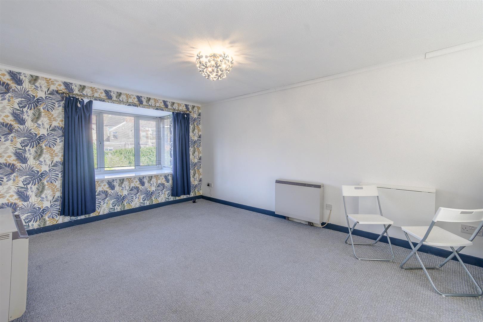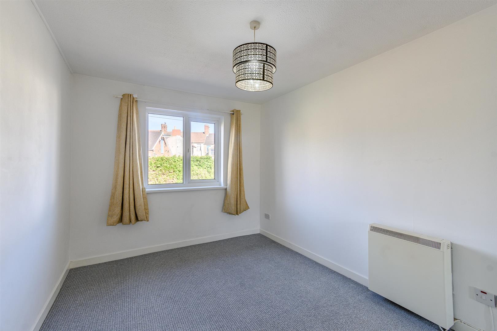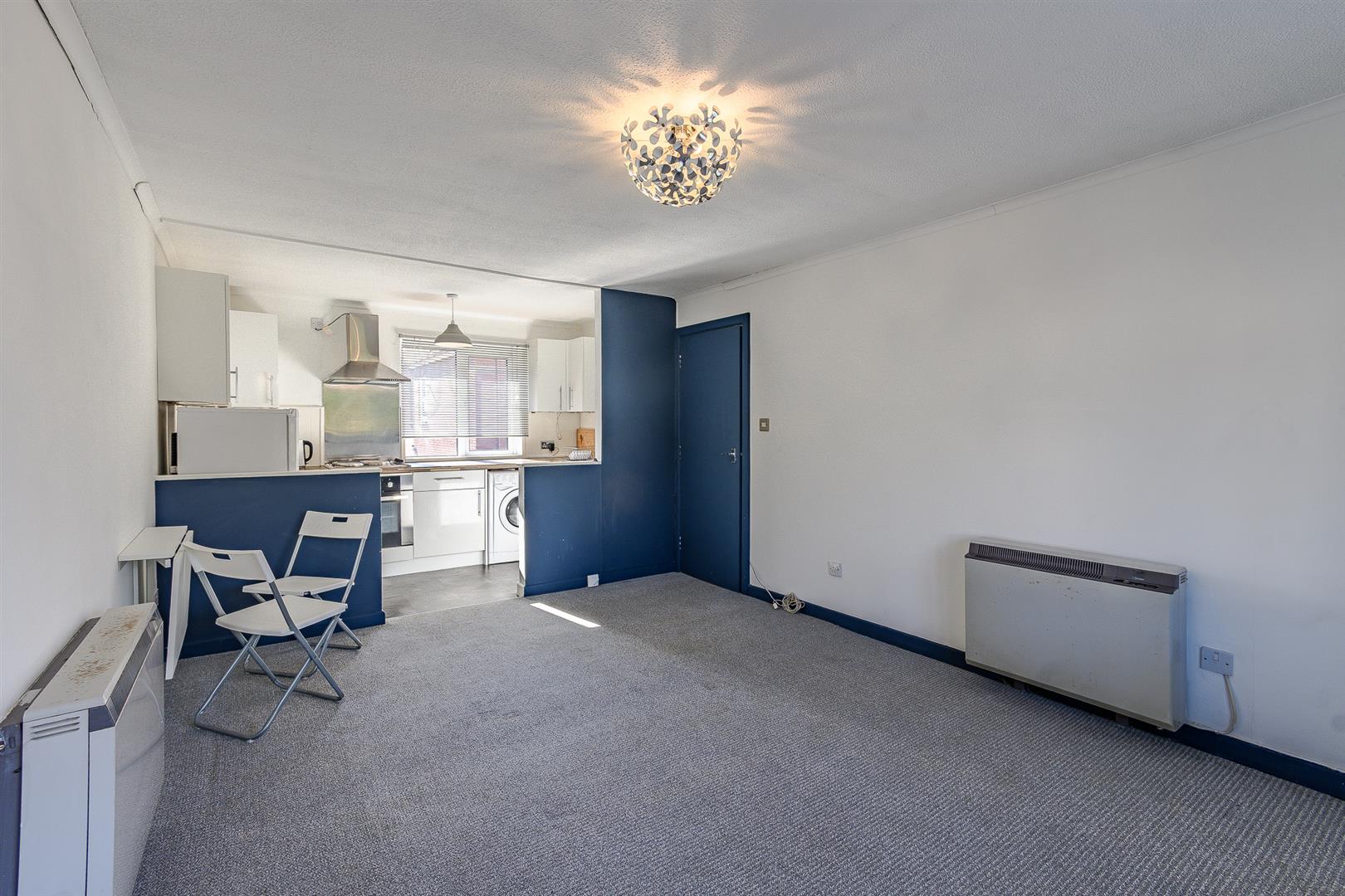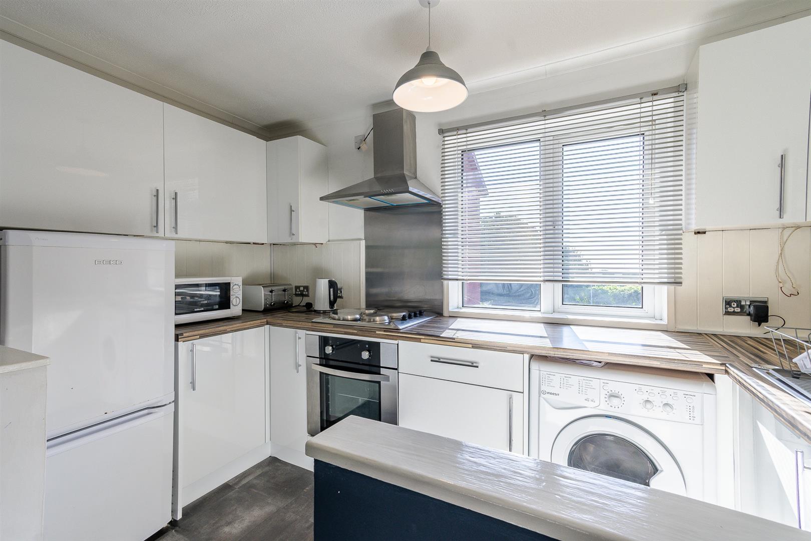 This open-plan space has a textured ceiling with coving, plastered walls, and fitted carpet flooring in the living area. It includes a wall-mounted electric heater and a UPVC double-glazed box window that overlooks the rear car park. The area opens into the kitchen, which is equipped with eye-level and base units, laminate work surfaces, and vinyl tile-effect flooring. Integrated appliances include an electric oven and an electric hob with a wall-mounted extractor fan and a stainless steel splashback. There is also a stainless steel sink with a mixer tap and drainer board, surrounded by splashback tiles and wood panelling. The kitchen has plumbing for a washing machine, space for a fridge-freezer, and a new UPVC double-glazed window overlooking the front aspect.