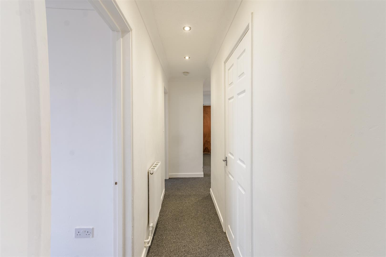 Textured ceiling with inset spotlights, coving, plastered walls. Loft access; UPVC double-glazed window overlooking the front aspect. Fitted carpet flooring; meter cupboard housing electric consumer unit and gas meter. Doors to bedrooms, living room, kitchen, family bathroom; wooden door to storage cupboard with wall-mounted combination boiler. Radiator.
