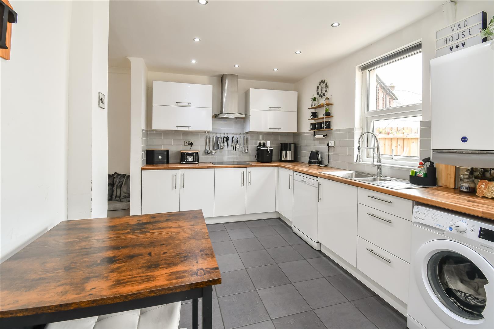 Smoothly plastered ceiling with inset lights, smoothly plastered walls. Porcelain tiled splashbacks. Ceramic tiled flooring. Wall mounted radiator. UPVC double glazed window to the rear elevation. UPVC double glazed French doors leading through to the rear garden. Through opening to dining. Modern fitted kitchen comprising of wall and base units. Wood laminate worktops. 1 1/2 bowl stainless steel sink. Integrated induction hob. Stainless steel cooker hood. Integrated double oven and microwave. Space for dishwasher, space for washing machine. Integrated fridge and freezer. Wall mounted combination boiler. Access to under stairs storage. Wood framed door with glass insert leading through to living room.