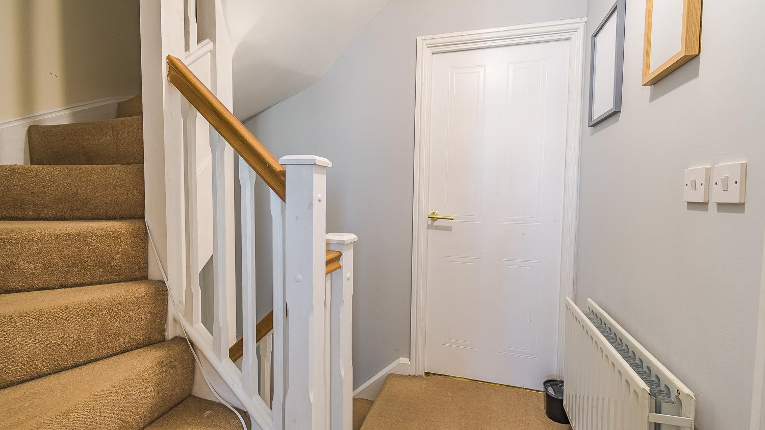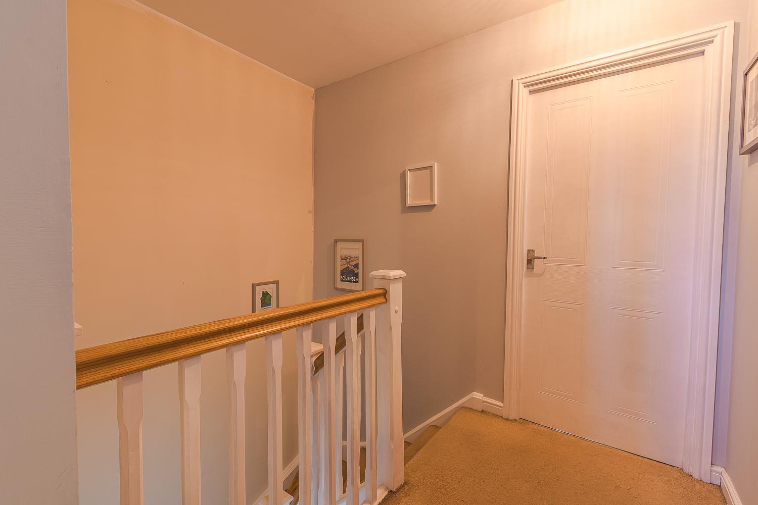 Smoothly plastered ceiling, smoothly plastered walls. Fitted carpet flooring. Wall mounted radiator. Fitted carpet staircase rising to the second floor. Fitted carpet staircase to ground floor. Wood panelled doors leading to master bedroom, living room and storage cupboard.