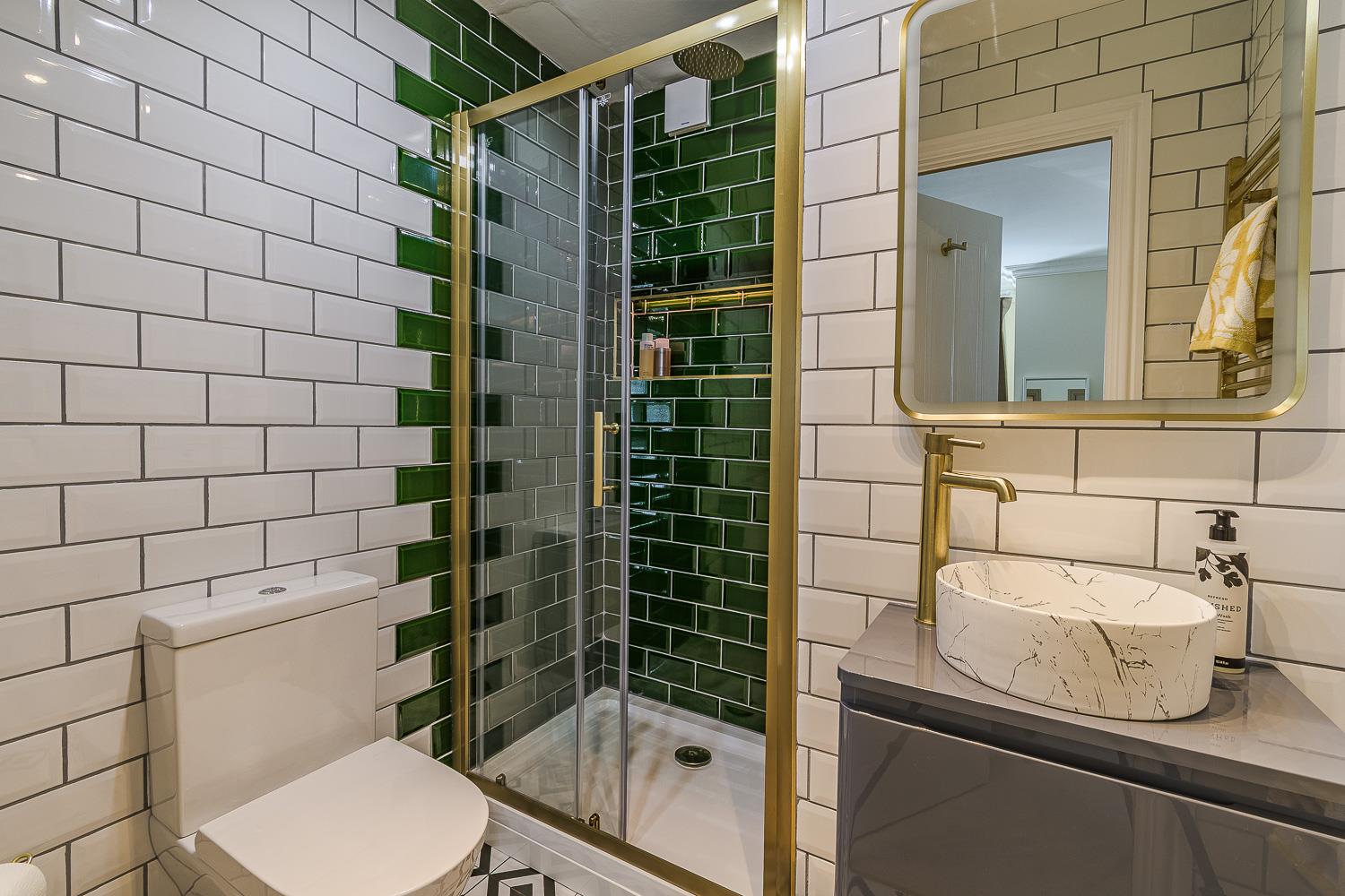Smoothly plastered ceiling, porcelain tiled walls with vent extractor. Porcelain tiled flooring. Wall mounted towel rail. Vanity wash hand basin. Double shower with thermostatically controlled shower overhead. Close coupled toilet.