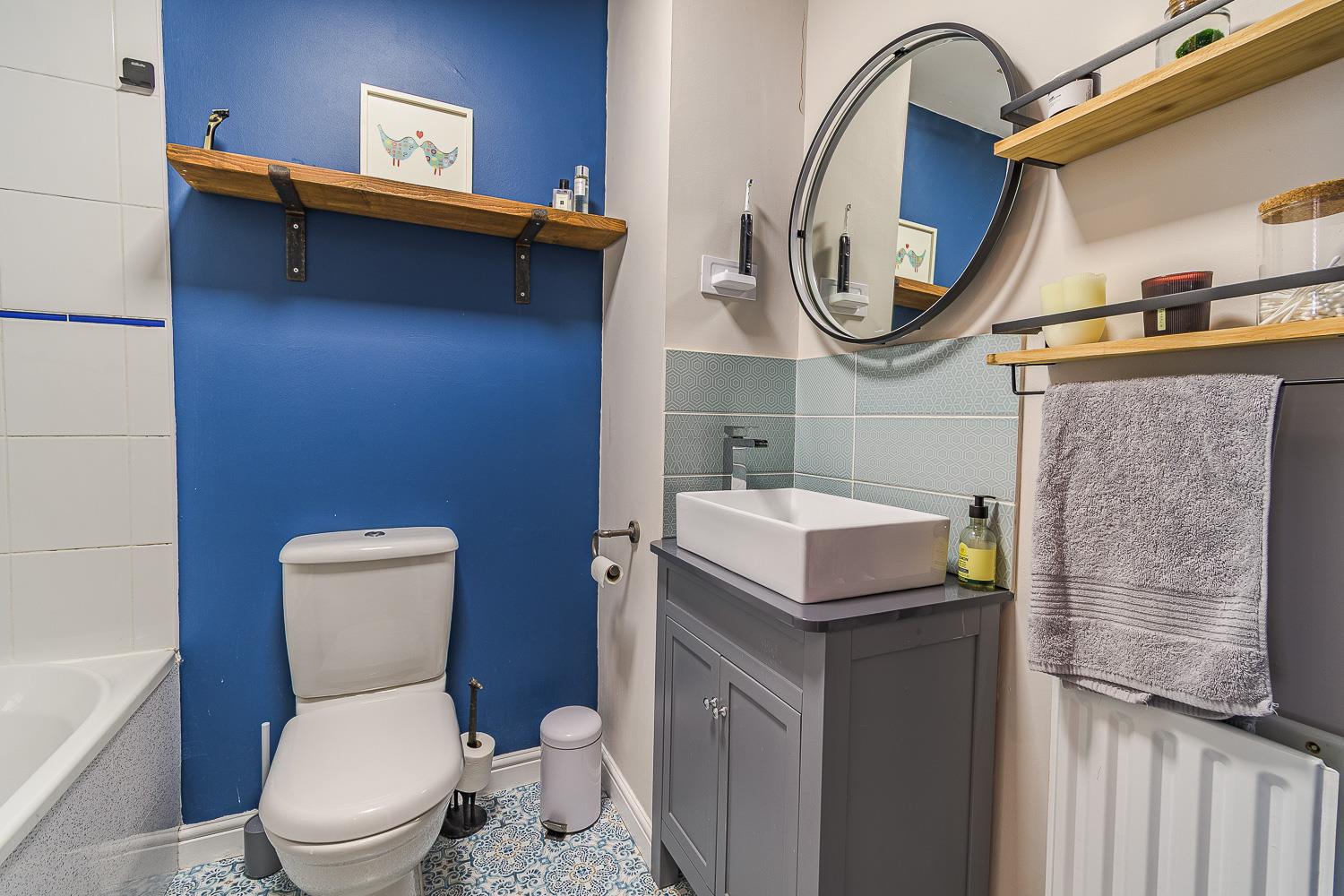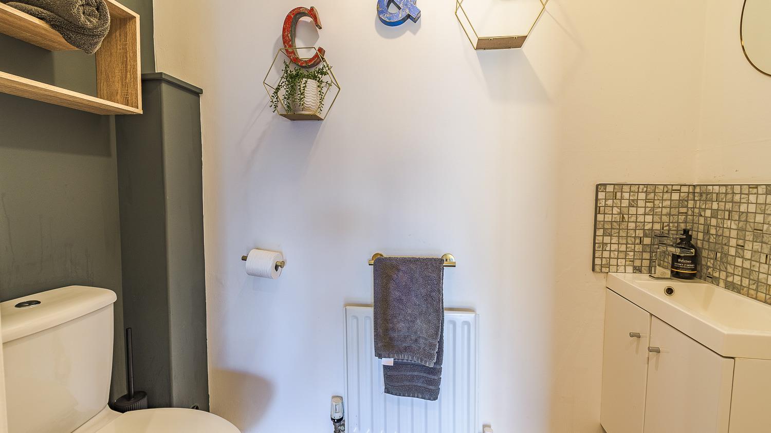 Smoothly plastered ceiling with vent extractor. Smoothly plastered walls. Wood laminate flooring. Wall mounted radiator. Vanity wash hand basin with ceramic tiled splashback. Close coupled toilet.