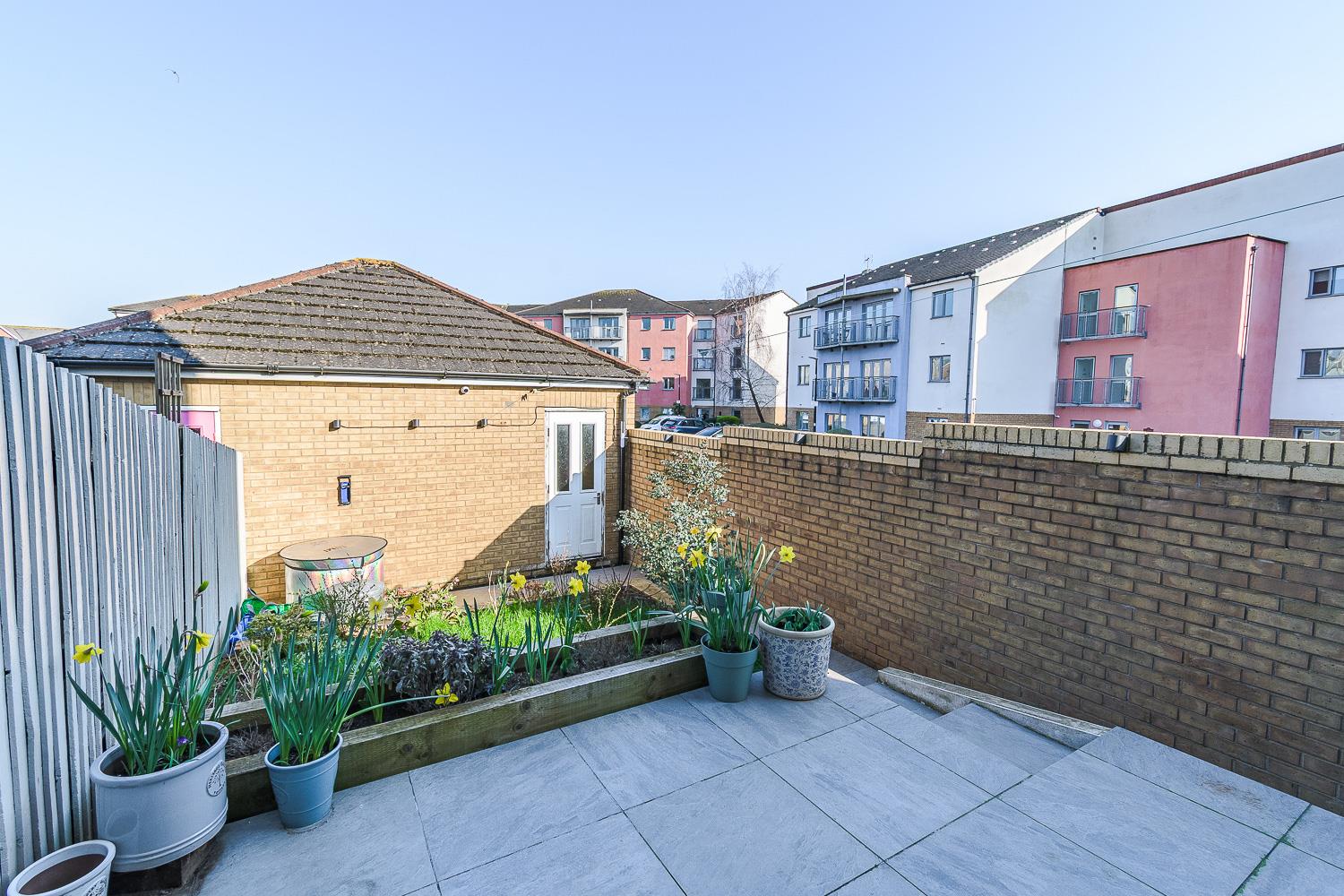 Enclosed rear garden with side access. Porcelain tiled patio area. Laid lawn. Raised sleeper beds with planted established shrubbery. Garage access.