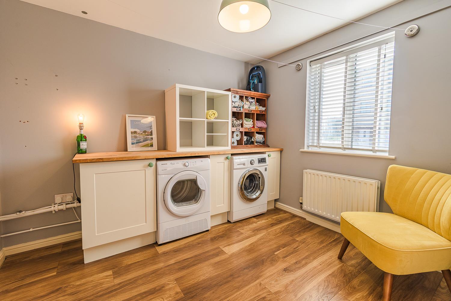 Smoothly plastered ceiling, smoothly plastered walls. Wood laminate flooring. Wall mounted radiator. UPVC double glazed window to the front elevation. Base units with solid oak worktop. Space for washing machine space for tumble dryer. Access to under stairs storage. Wood panelled door leading through to the entrance hallway.
