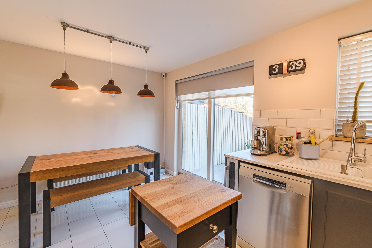 Smoothly plastered ceiling, smoothly plastered walls. Porcelain tiled flooring. UPVC double glazed window to the rear. UPVC double glazed sliding patio doors leading out to the rear garden. Wall mounted radiator. Modern fitted kitchen, comprising of wall and base units. Composite worktops. Five ring Smeg gas hob. Integrated oven. Cooker hood. Porcelain sink. Space for fridge freezer, space for dishwasher. Integrated wine cooler. Wall mounted combination boiler.