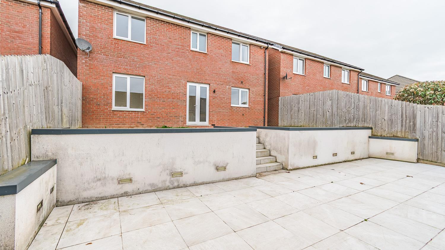 An enclosed rear garden with Laid to lawn. Porcelain pathway leading to steps descending to a large porcelain tiled patio area, walled enclosure with integrated lighting. Feather edged fencing surrounding. Side access to front.