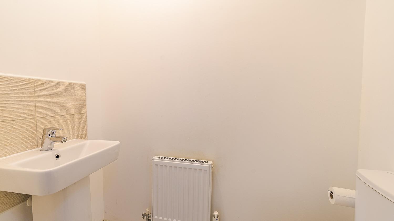 Smoothly plastered ceiling with vent extractor, smoothly plastered walls. Porcelain tiled flooring. Wall mounted radiator. Pedestal wash hand basin with ceramic tiled splashbacks. Close coupled toilet.