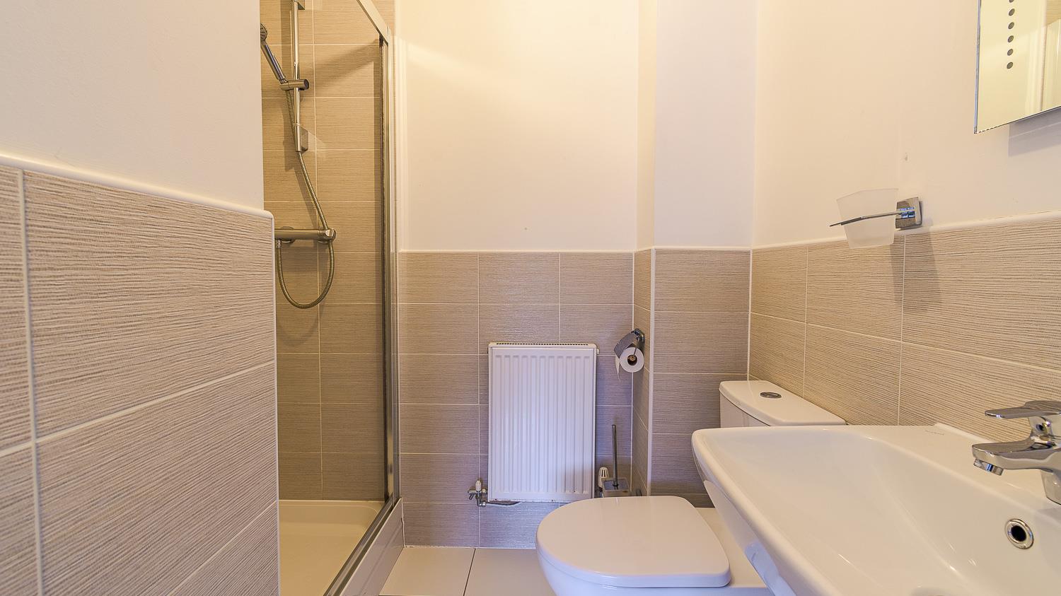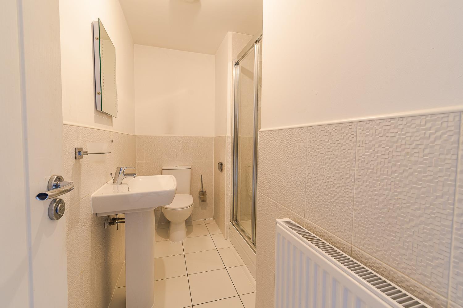 Smoothly plastered ceiling with vent extractor, smoothly plastered walls. Ceramic tiled flooring and splashback's. Wall mounted radiator. Pedestal wash basin, close coupled toilet. Double shower with thermostatically controlled shower overhead.