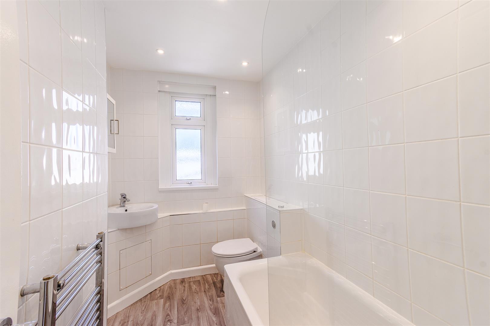 Plastered ceiling with inset spotlights; ceramic wall tiling; wood-effect vinyl flooring. UPVC double-glazed obscure window to side. Ceramic sink with mixer tap; WC with enclosed cistern; vertical towel rail. Bath with twin taps and mains-operated shower over.