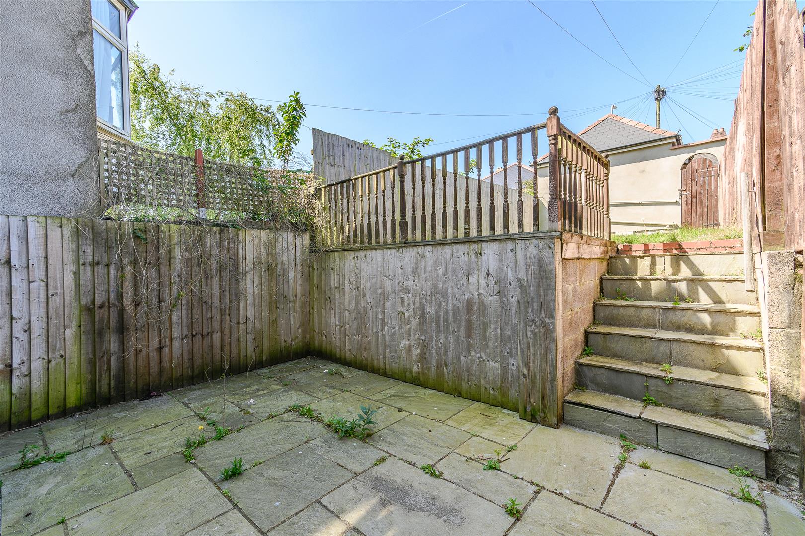 Indian flagstone patio; steps to laid lawn; featheredge fenced boundaries. Wooden gate to rear access onto Park Crescent. Outside sockets, lighting, and tap.