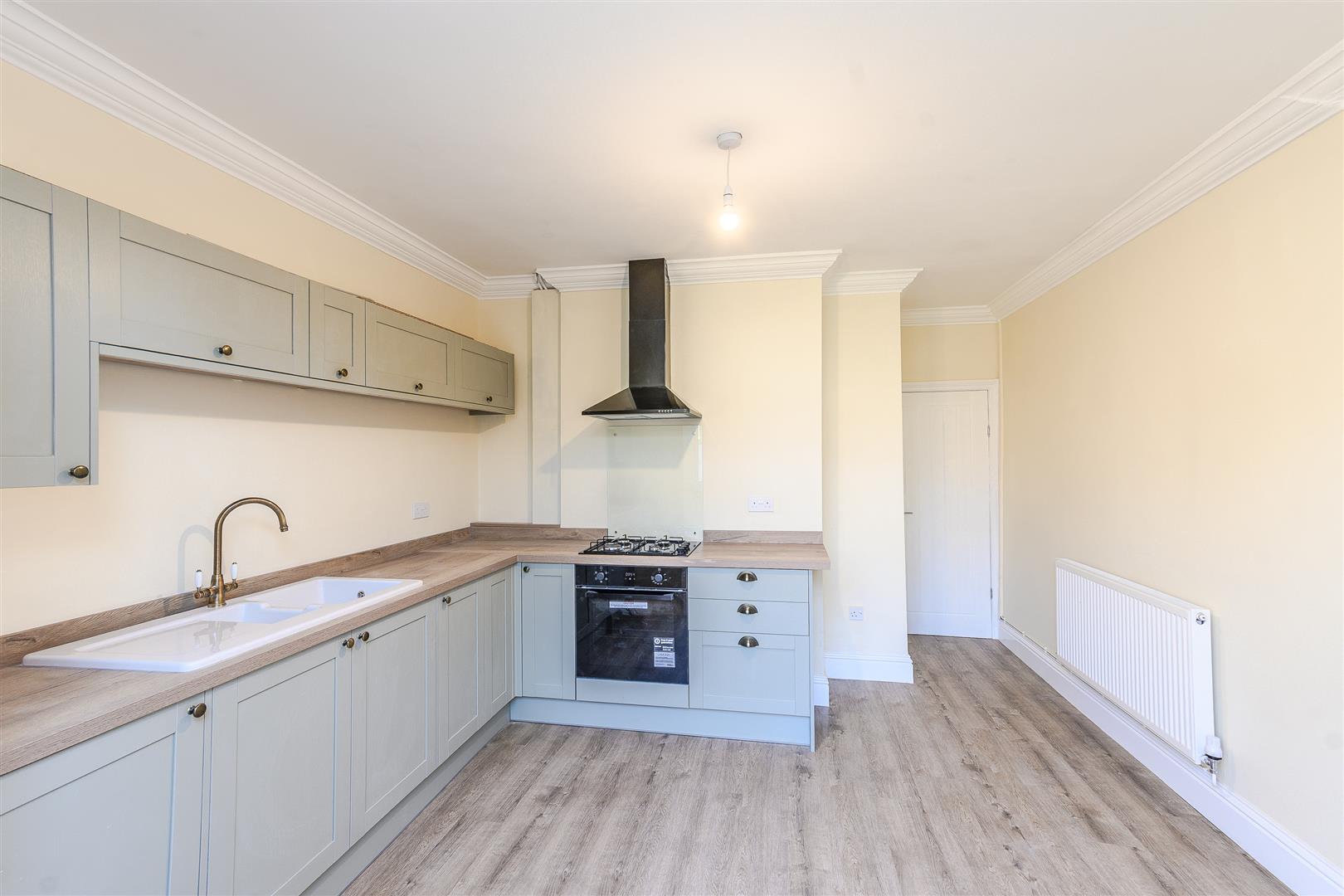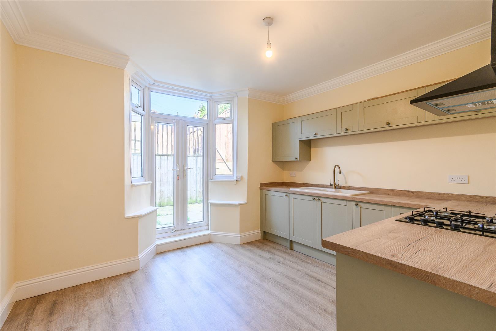 Plastered ceiling with traditional coving; plastered walls; continuation of wood-effect Karndean flooring. UPVC double-glazed bay with French doors to rear garden. Fitted wall and base units; wood-effect laminate worktops with uprisers; integrated electric oven and gas hob with extractor and glass splashback. Undercounter fridge; space for fridge-freezer; 1.5-bowl ceramic sink with Victorian-style mixer tap.