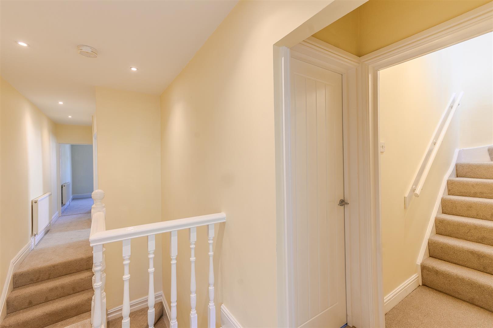 Smooth plastered ceiling with inset spotlights; plastered walls; wall-mounted radiator. Split-level landing; carpeted stairs; doors to four bedrooms and family bathroom; further door to staircase rising to second floor.