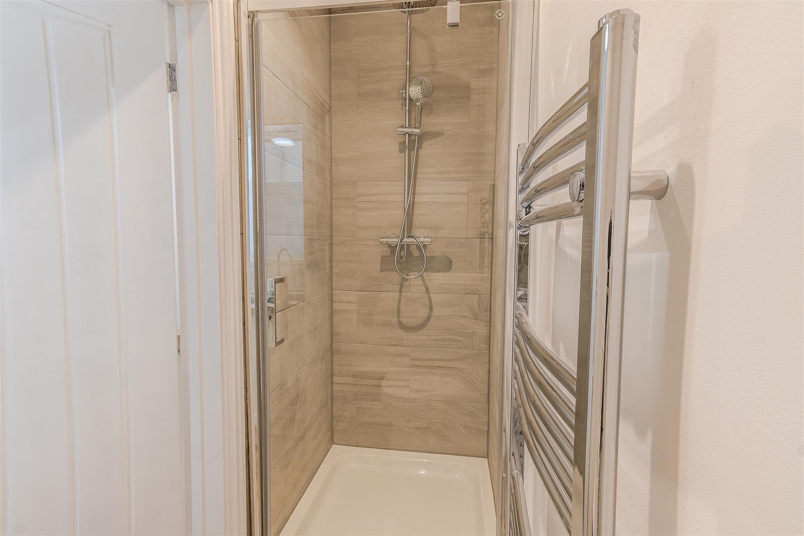 Plastered ceiling with inset spotlights and extractor; plastered walls; porcelain tiled floor. Close-coupled WC with integrated basin and mixer tap; vertical towel rail. Shower cubicle with glass screen, porcelain-tiled surround, mains-operated twin-head shower.