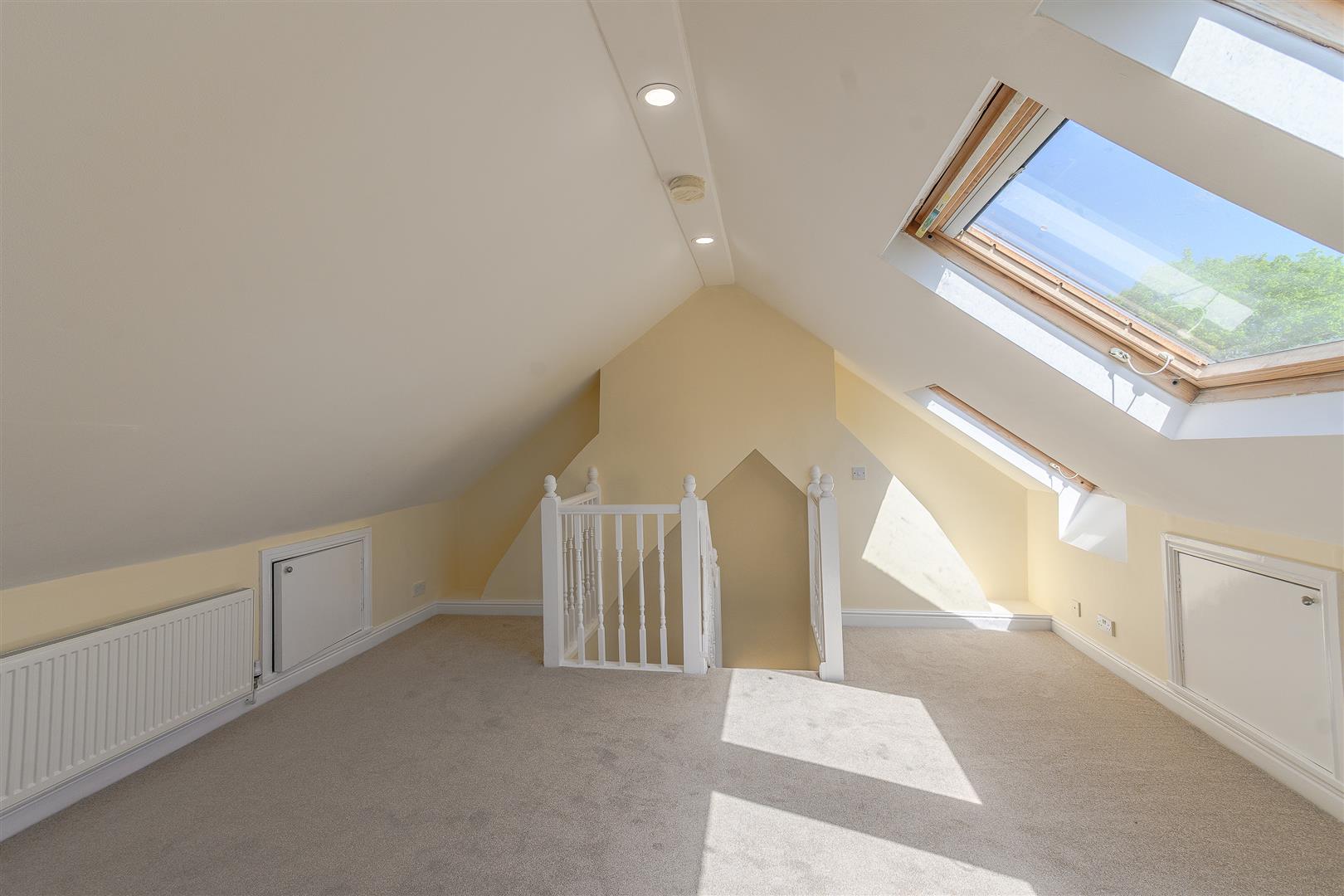 Plastered ceiling with inset spotlights; plastered walls; fitted carpet; storage to eaves. Wall-mounted radiator; triple wooden-framed, double-glazed Velux windows to front with panoramic sea views over the Bristol Channel. Wooden balustrade to stair void.