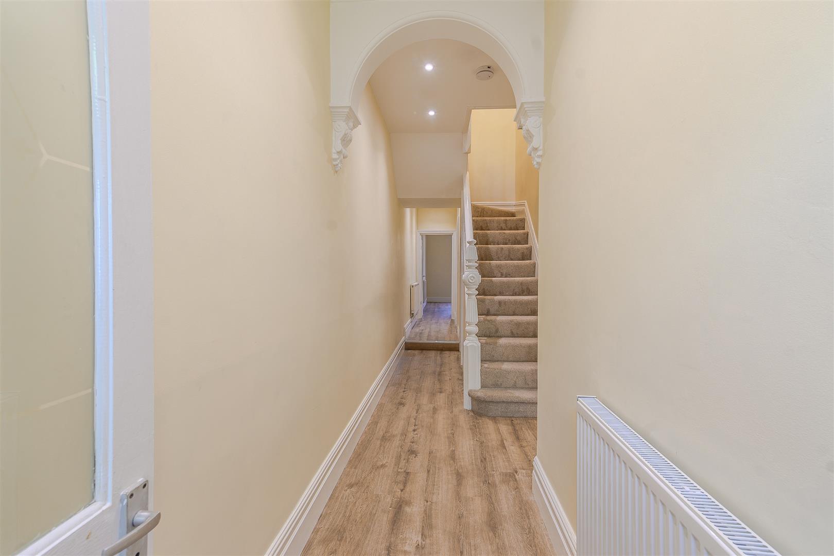 Plastered ceiling with traditional coving and corbels, inset spotlights. Karndean wood-effect flooring, wall-mounted radiator. Oak doors to living room, utility, and kitchen/dining; understairs storage; carpeted stairs with traditional balustrade to first floor.