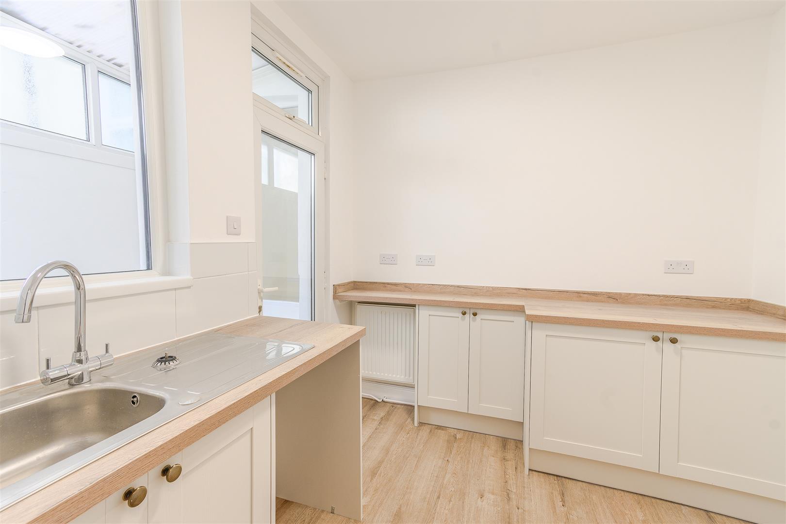 Plastered ceiling and walls; continuation of Karndean flooring. Base units with work surfaces and uprisers; stainless steel sink with mixer tap; plumbing for washing machine. UPVC double-glazed window and door to conservatory; wall-mounted radiator. Wooden door to ground-floor shower room.