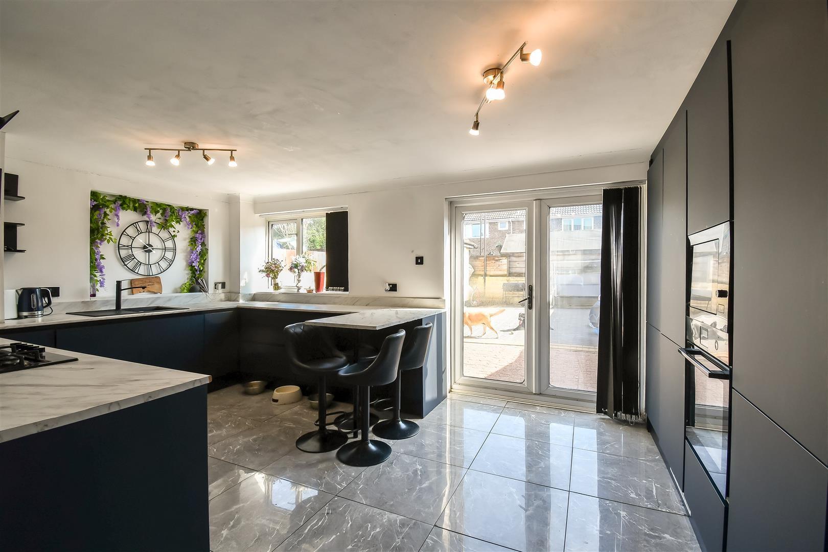Smoothly plastered ceiling with coving, smoothly plastered walls. Porcelain tiled flooring. UPVC double glazed window to the rear elevation. UPVC double glazed French doors leading out to the rear garden. Modern fitted kitchen, comprising of base units. Floor to ceiling larder cupboards. Wood laminate worktops and up stands. Integrated full size fridge and freezer, integrated microwave and separate fan assisted oven, Five ring gas hob. Integrated dishwasher. Composite sink. Breakfast bar area. Through opening to living.