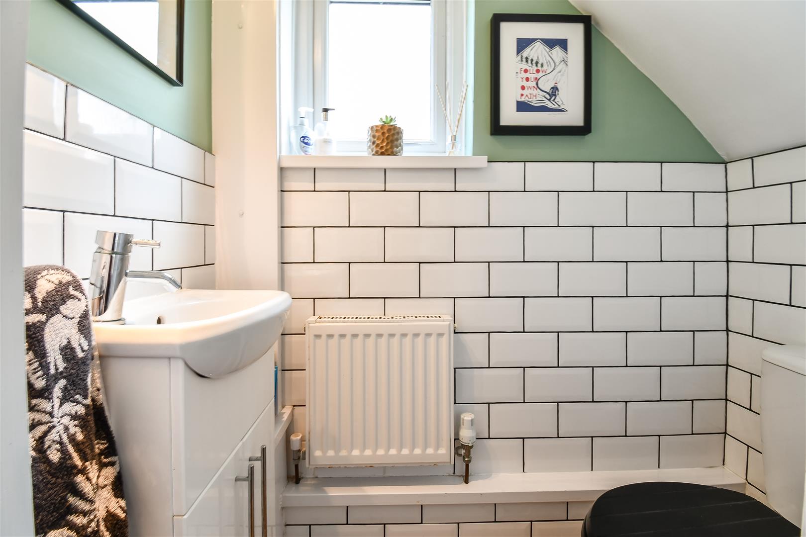 Smoothly plastered ceiling, Metro style tiled walls. Vinyl flooring. Wall mounted radiator. UPVC double glazed window with obscured glass insert to the side elevation. Vanity wash hand basin, close coupled toilet. Wood panelled door leading through to the entrance hallway.