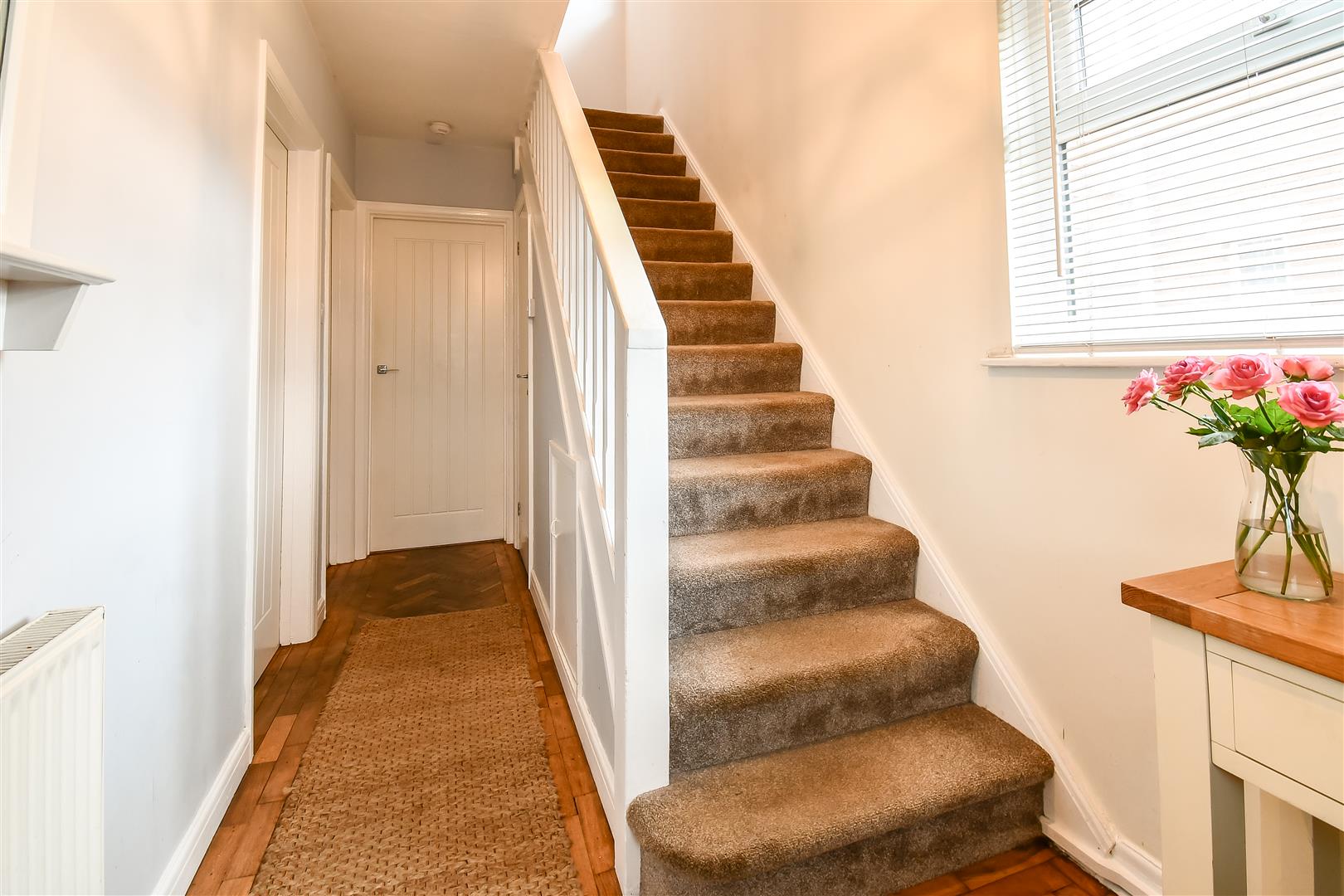 Smoothly plastered ceiling, smoothly plastered walls. Original parquet flooring. Wall mounted radiator. UPVC double glazed window to the side elevation. Fitted carpet staircase rising to the first floor. Wood panelled doors leading to living room, sitting room, utility area and W.C. cloakroom. Wood framed door leading through to the entrance porch.