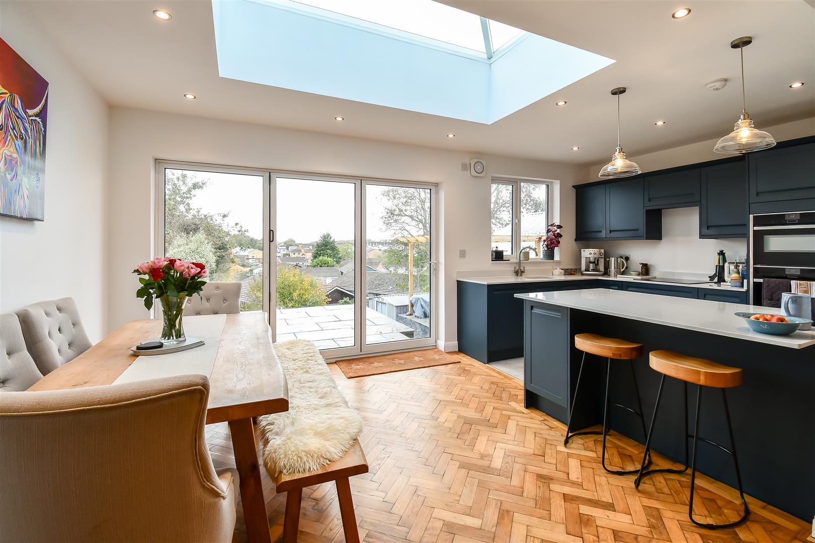 Upon entering, you are greeted by an inviting entrance porch that leads into a spacious hallway adorned with original parquet flooring. The ground floor boasts two reception rooms, including a cosy living room complete with a log-burning stove, and the continuation of the original parquet flooring perfect for those chilly evenings. The sitting room seamlessly flows into an extended open-plan kitchen and dining area, which is a highlight of the home. This modern kitchen is equipped with integrated appliances and features a stunning lantern roof, allowing natural light to flood the space. Bi-folding doors open up to the rear garden, creating a wonderful indoor-outdoor living experience. Additionally, the ground floor includes a utility area and a convenient cloakroom.