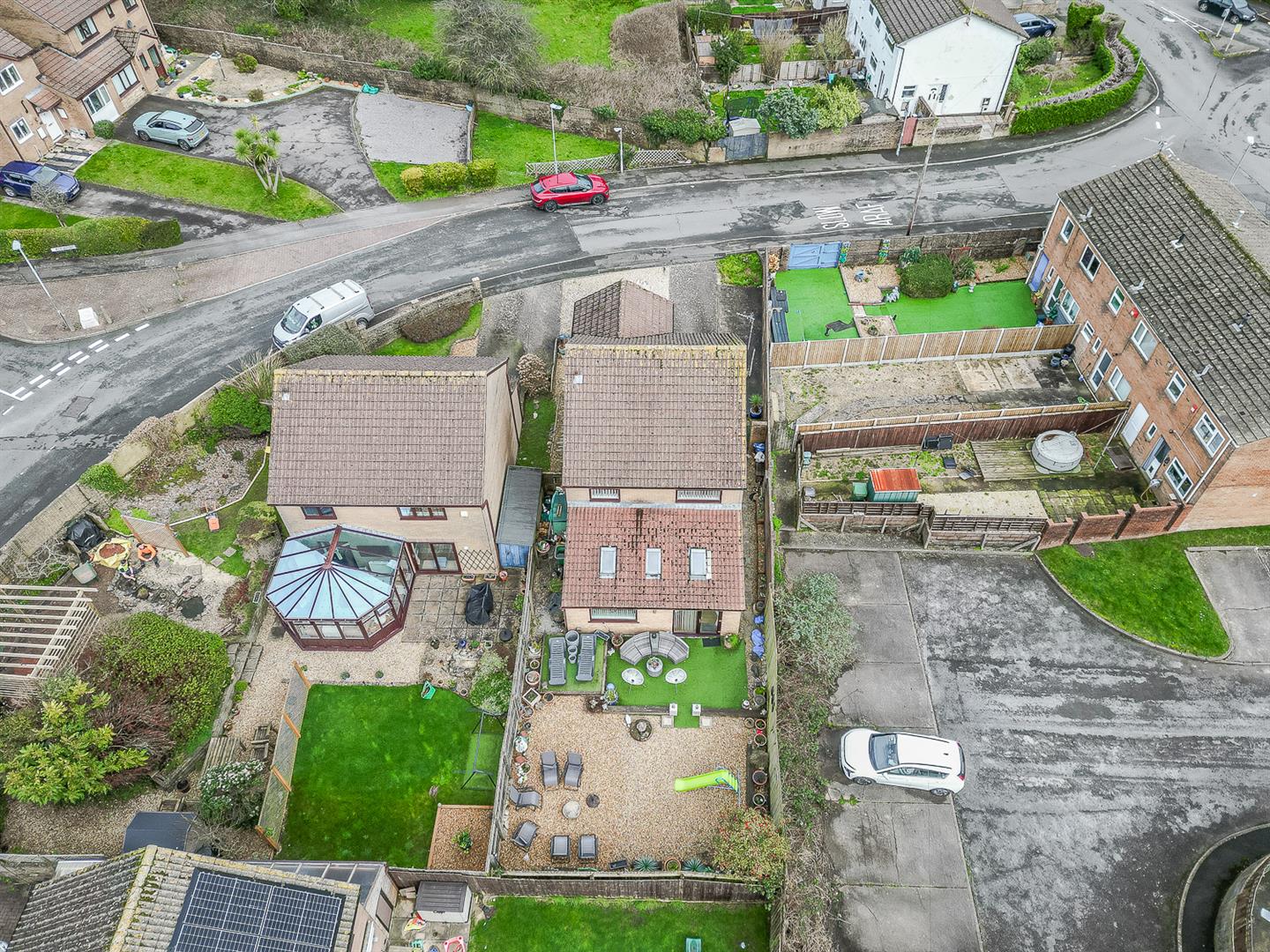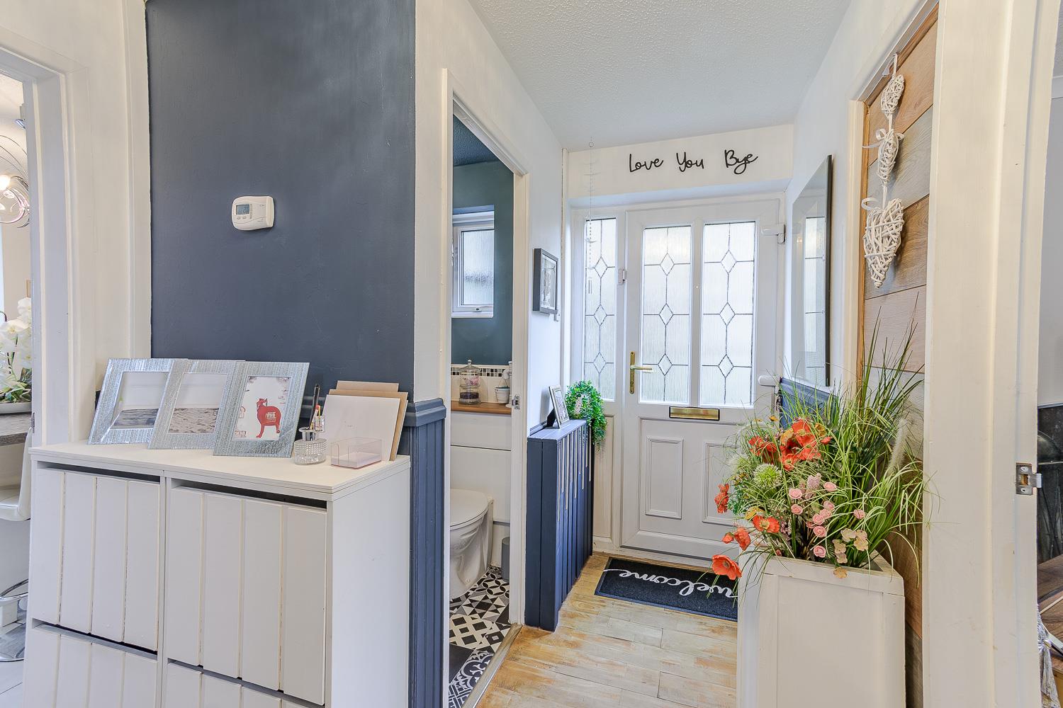 Large driveway accommodating multiple vehicles. Decorative frontage with stone chippings, timber pathways, mature shrubbery. Access via UPVC double-glazed side door to entrance hallway.
