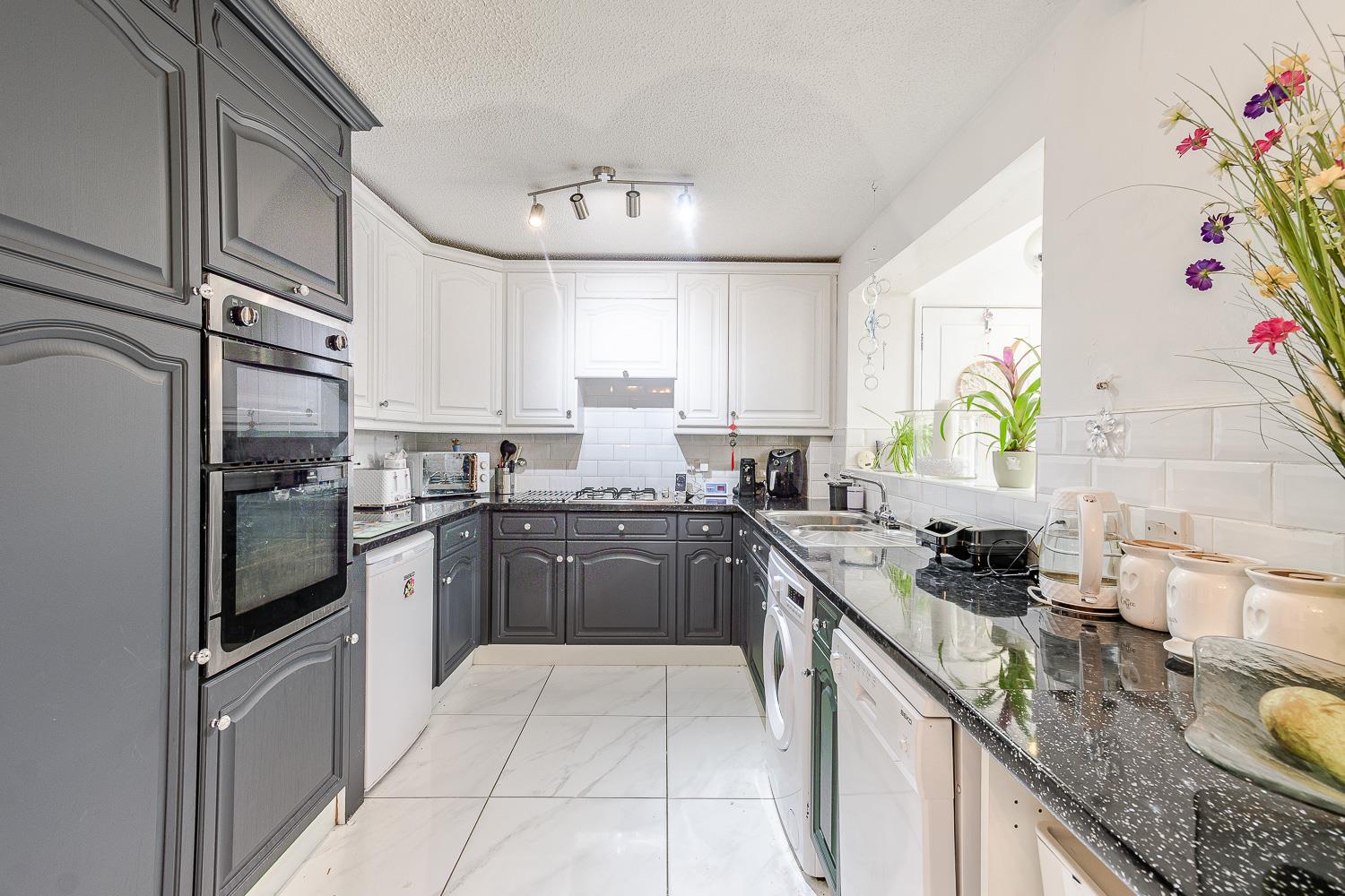 Textured ceiling, plastered walls with ceramic splashback tiles; high-gloss marble-effect tile flooring. Wall-mounted radiator; space for dining; opening into extended living area. Units: eye-level wall cupboards and base units; laminate work surfaces. Appliances: space for fridge/freezer and under-counter fridge; plumbing for washing machine and dishwasher. Integrated electric oven and grill; four-ring gas hob with extractor above. Stainless steel 1.5 bowl sink with mixer tap and drainer.