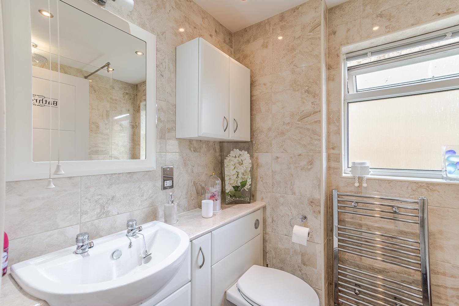 Textured ceiling, plastered walls with ceramic tiles, tile-effect vinyl flooring. Close-coupled toilet, wall-mounted wash basin with mixer tap, vertical towel rail heater. UPVC double-glazed obscure glass window to side aspect.