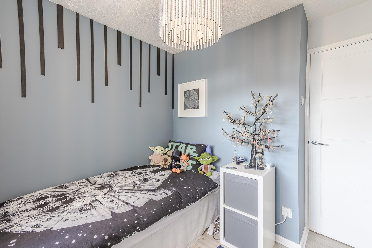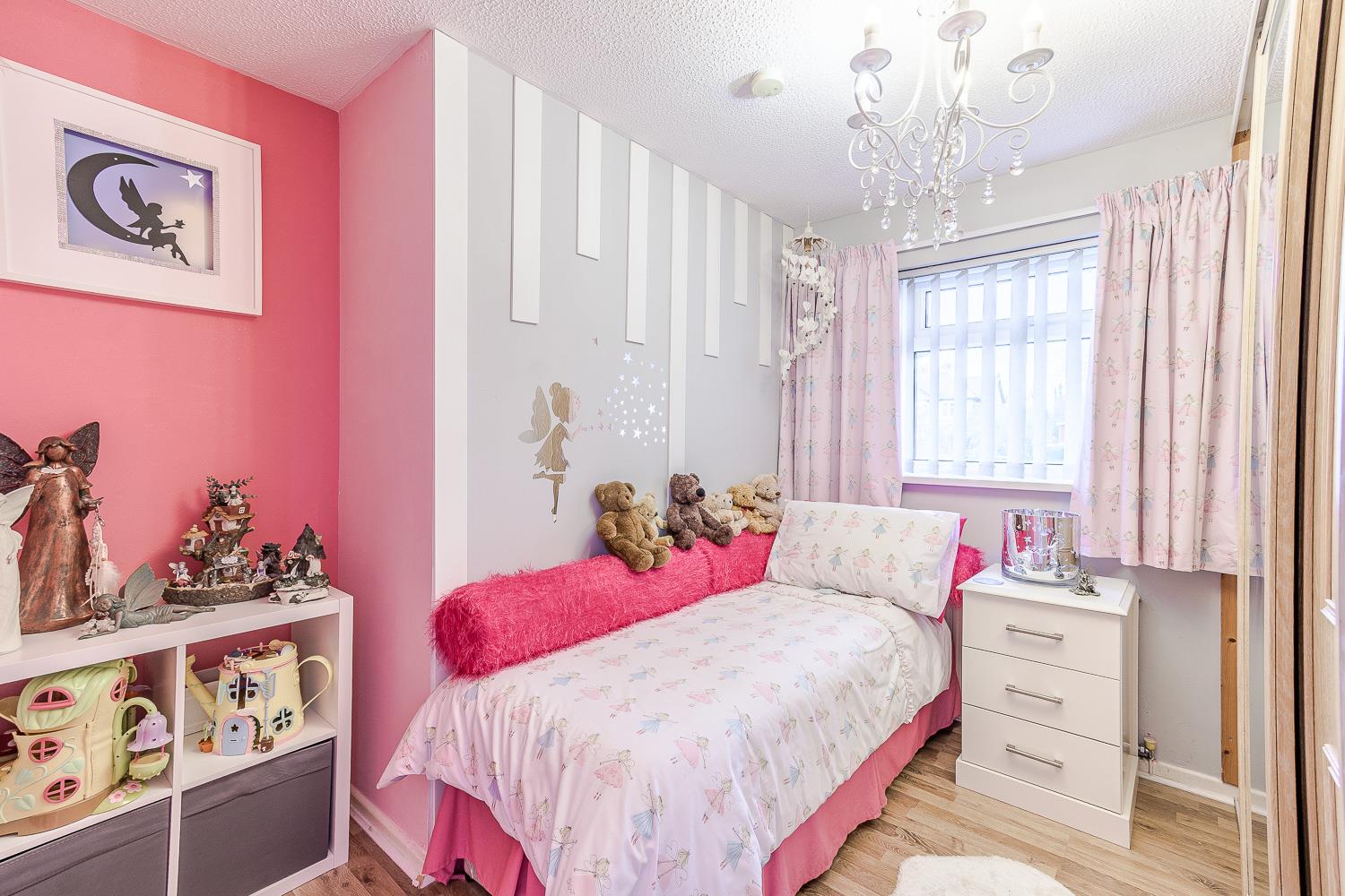 Textured ceiling, plastered walls, wood-effect flooring. UPVC double-glazed window overlooking rear garden. Decorative wood wall panelling; radiator; space for wardrobes.