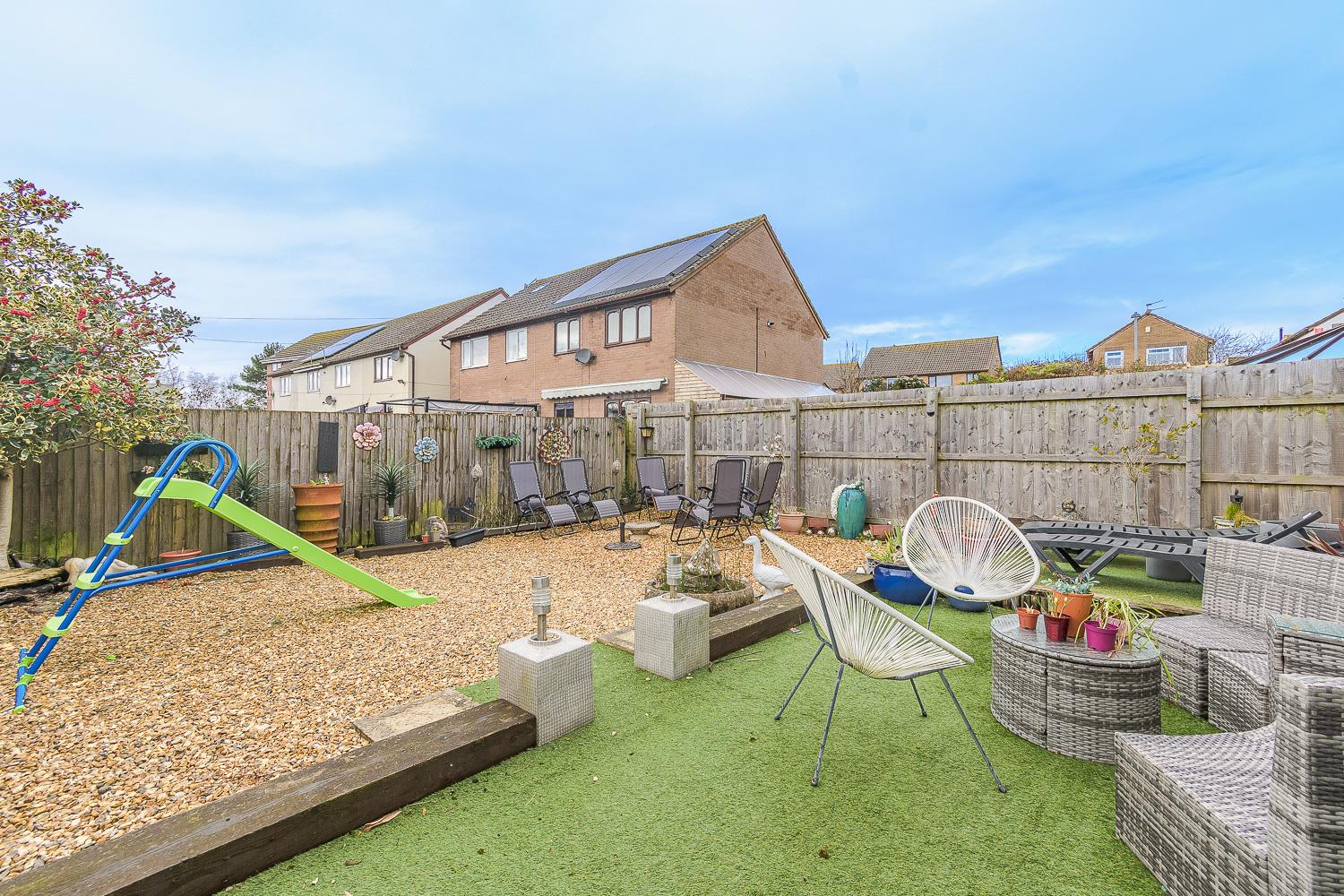 Level, family-sized garden with timber fencing. Artificial grass area, stone chippings, raised flower beds with mature shrubbery. Side access with gate; further side area for bin storage or garden shed. Wall-mounted lighting, external electric sockets, outside tap.