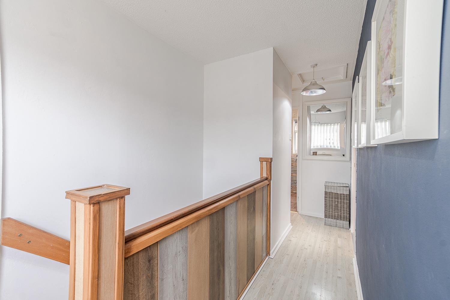 Textured ceiling, plastered walls, wood-effect flooring. UPVC double-glazed window to side aspect; wall-mounted radiator; loft access. Doors to bedrooms, family shower room, and storage cupboard with fitted shelving.