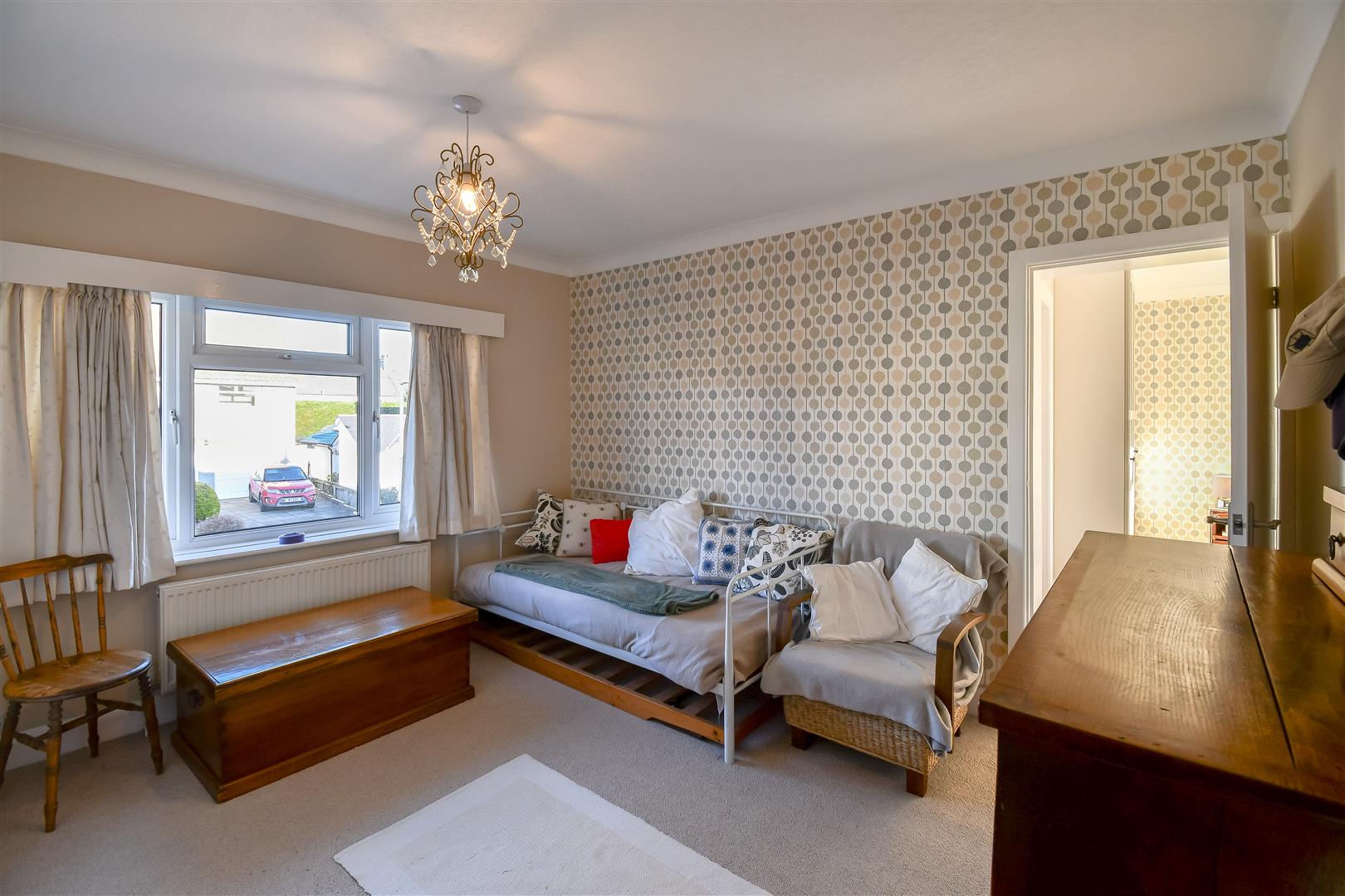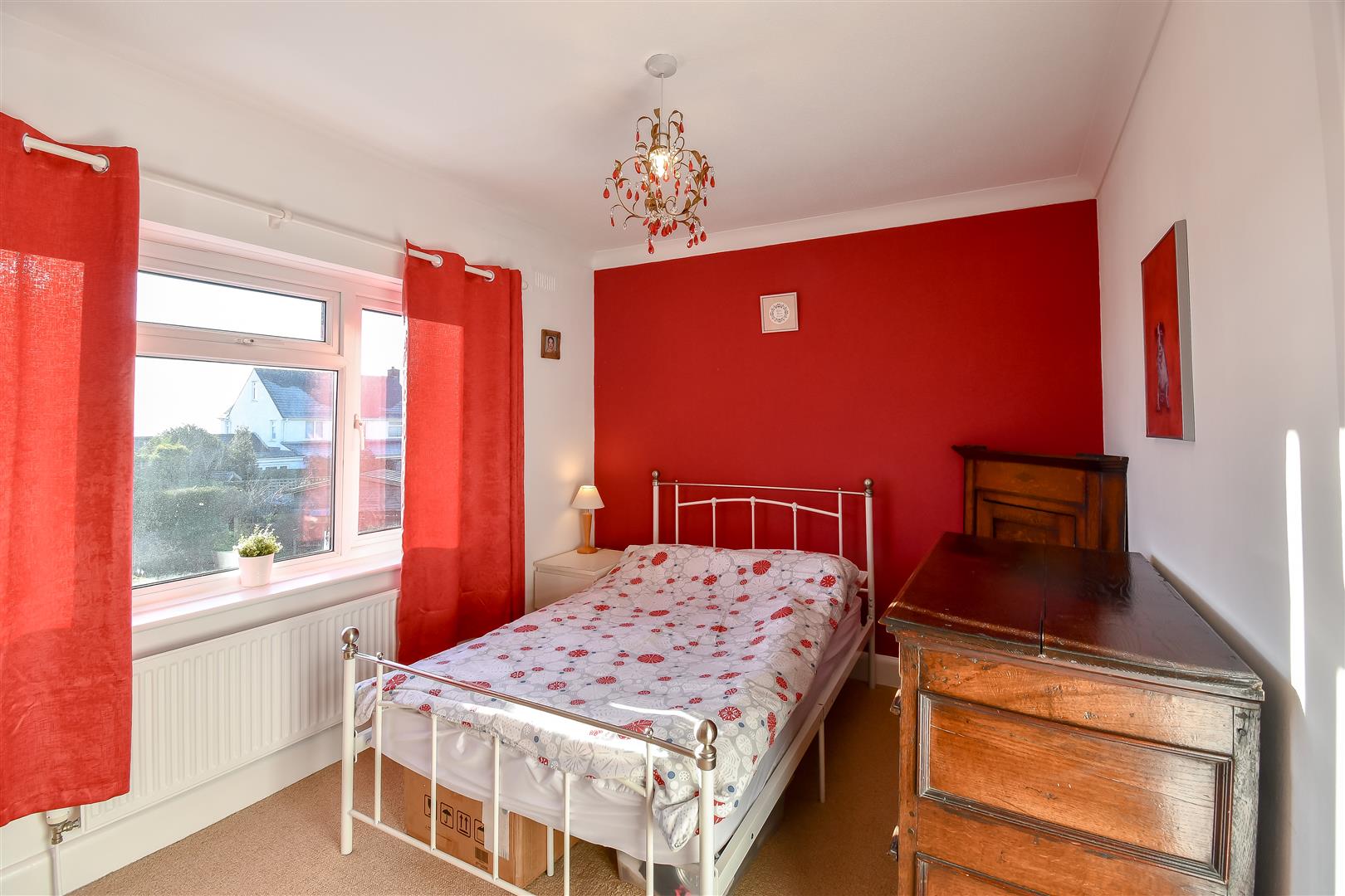 Papered ceiling with coving, papered walls, fitted carpet flooring, UPVC double glazed window overlooking the front garden and front elevation. Wall mounted radiator.