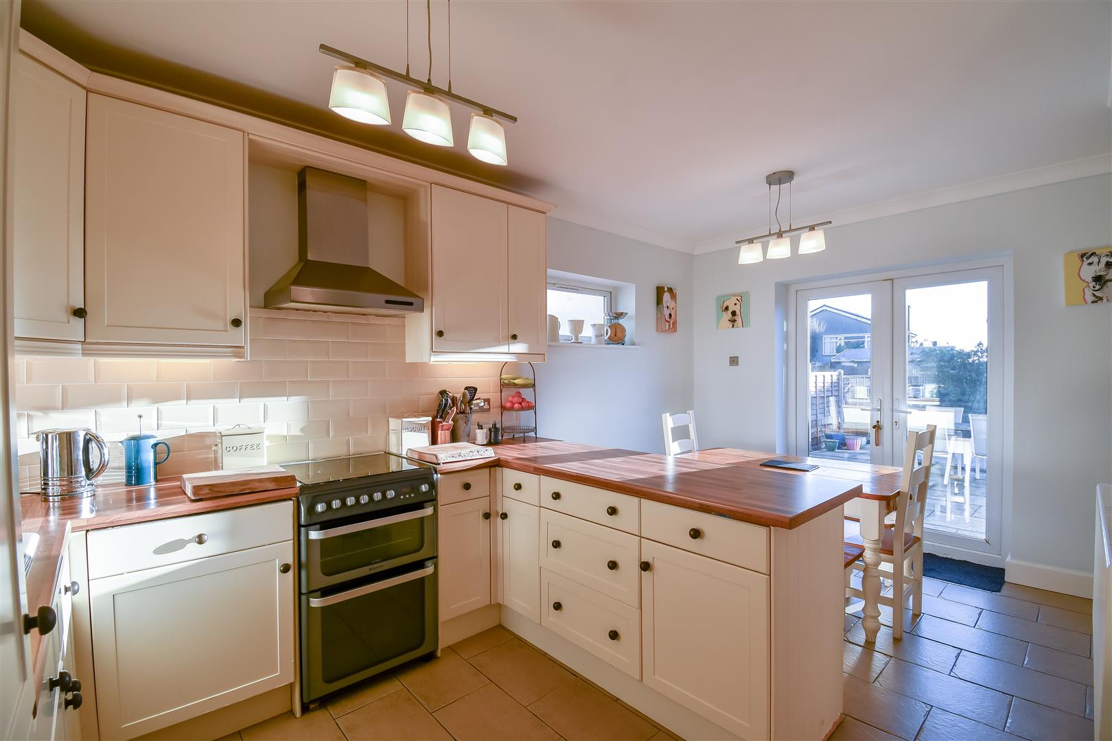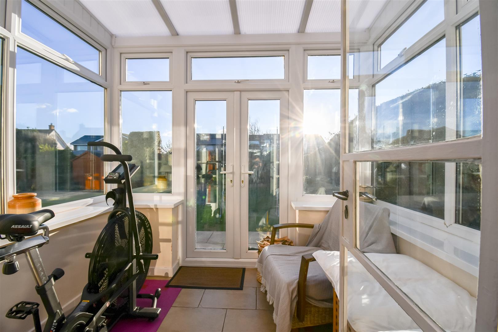 Polycarbonate roof, UPVC double glazed windows surrounding, tiled flooring. French doors opening to the rear garden.