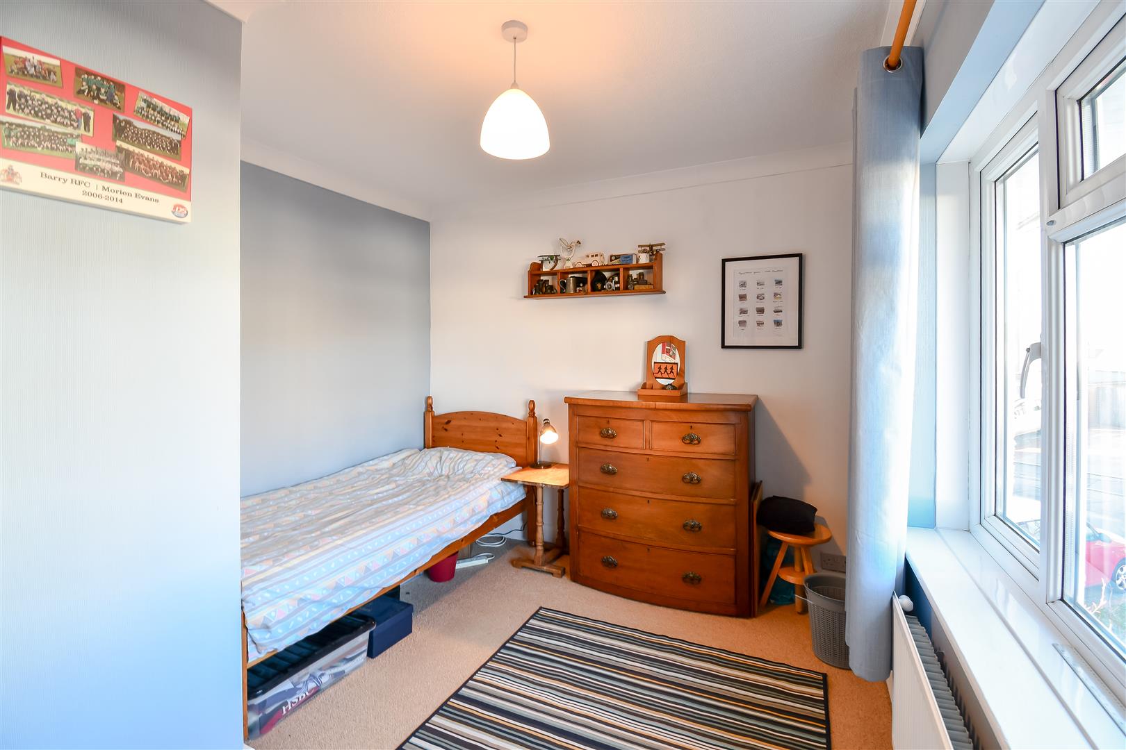 Papered ceiling with coving, papered walls, fitted carpet flooring, radiator. UPVC double glazed window overlooking the rear with sea views across the Bristol Channel and beyond.