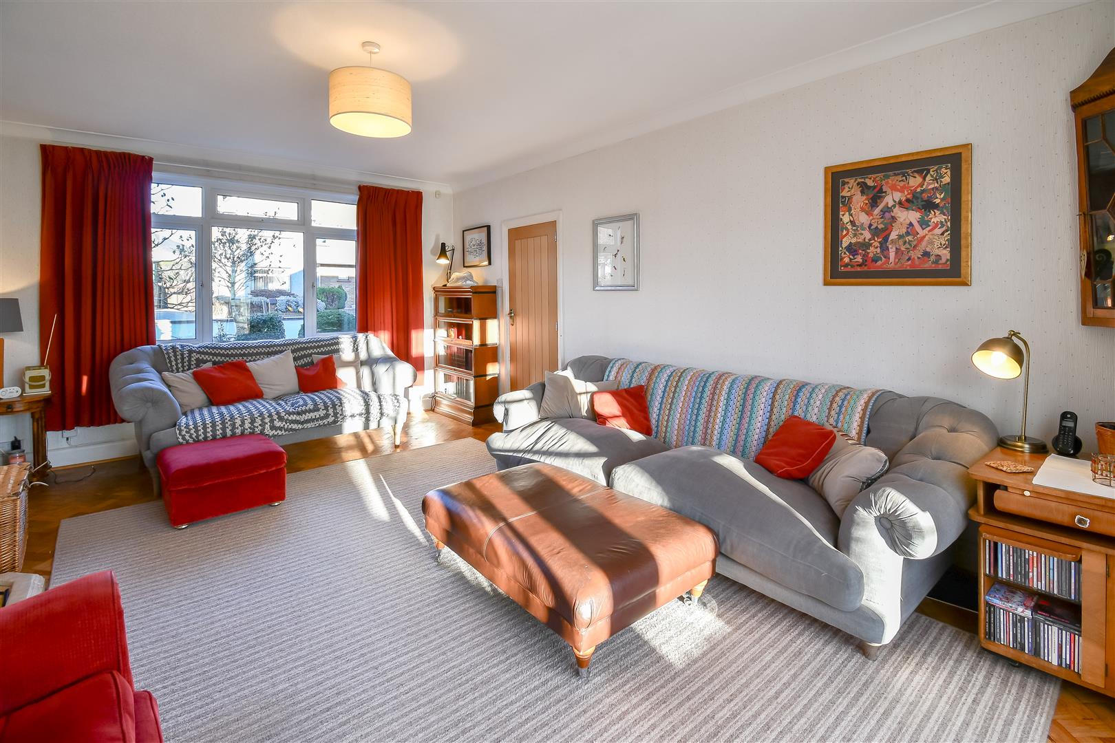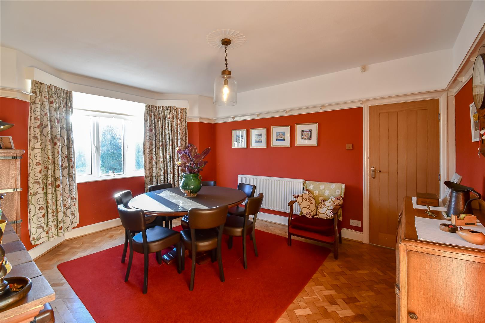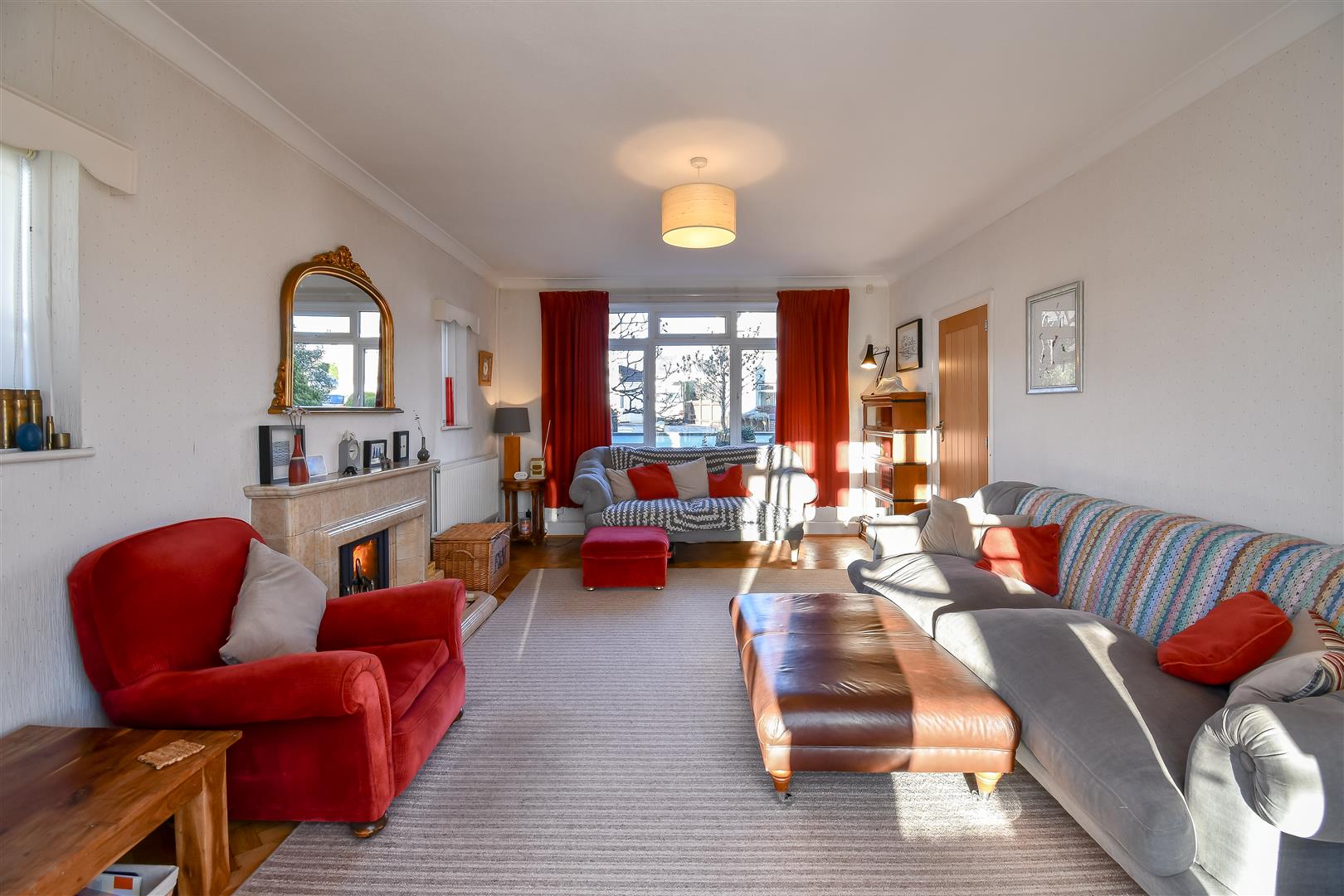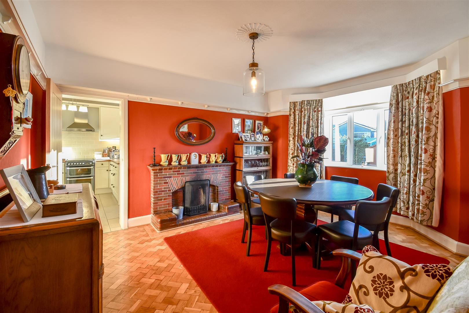 Papered ceiling with coving, papered walls, original parquet flooring, UPVC double glazed window to the front and side elevations. Traditional doors opening to sunroom. Fireplace with inset wood burning stove and tile surrounds. Wall mounted radiator.