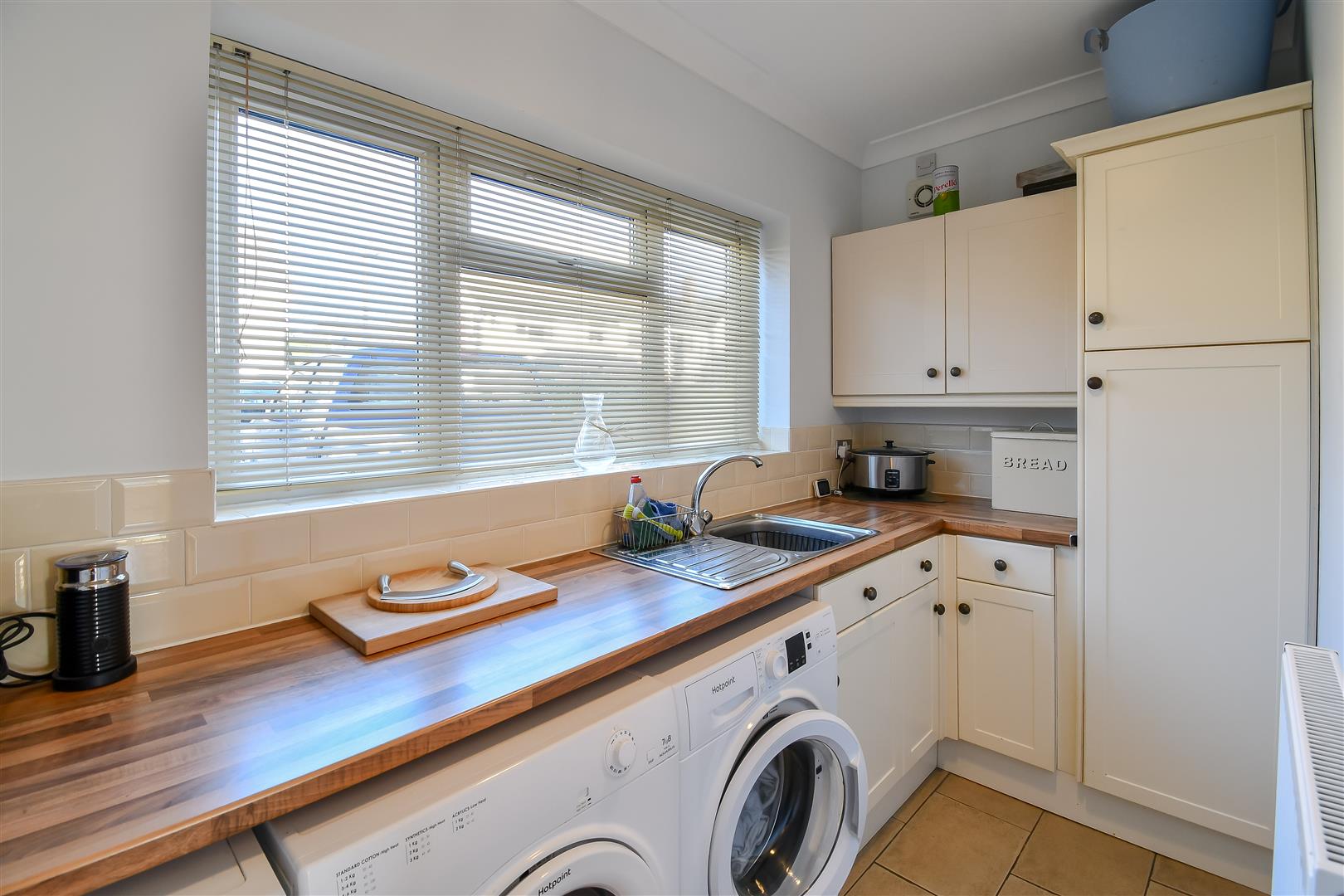 Plastered ceiling with coving, plastered walls, continuation of tiled flooring. UPVC double glazed window overlooking the front aspect. Radiator. Utility area comprises of eyelevel units, base units, larder cupboard. Stainless steel sink with draining board, mixer tap over. Plumbing for washing machine. Space for tumble dryer and undercounter freezer. Extractor Fan.