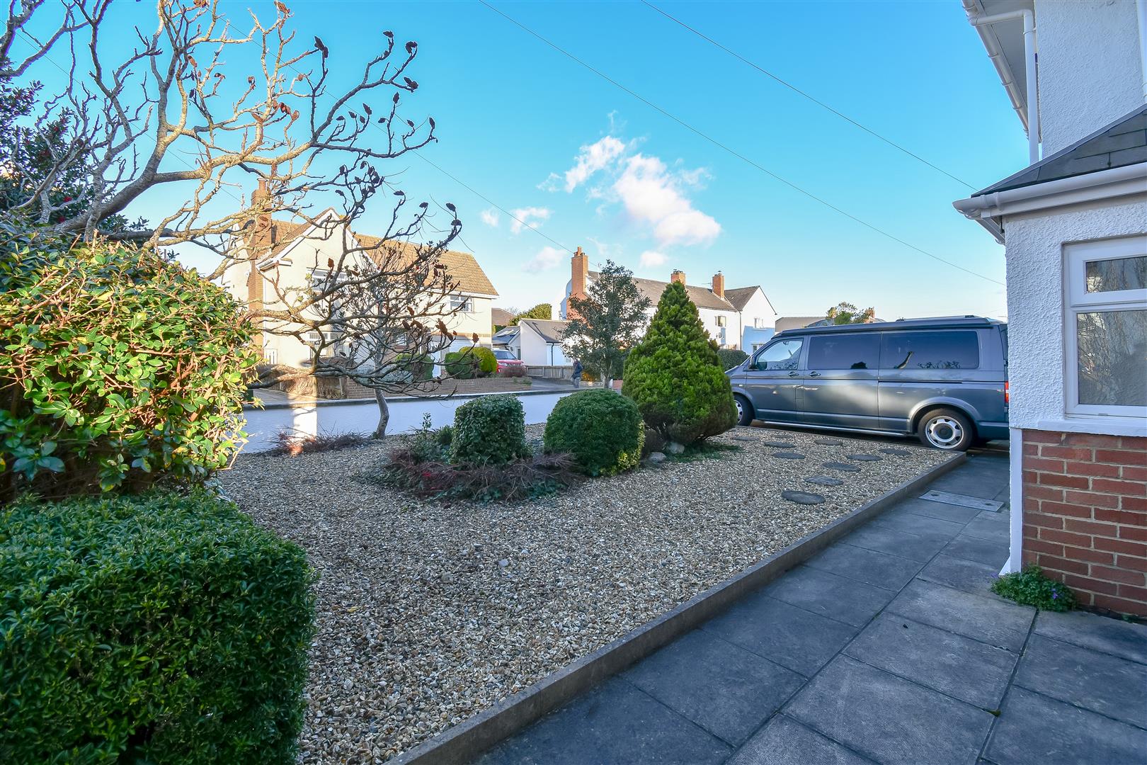 Paved driveway for multiple vehicles. Front garden with stone chippings and mature shrubbery. Access to storm porch via a UPVC double glazed front door.
