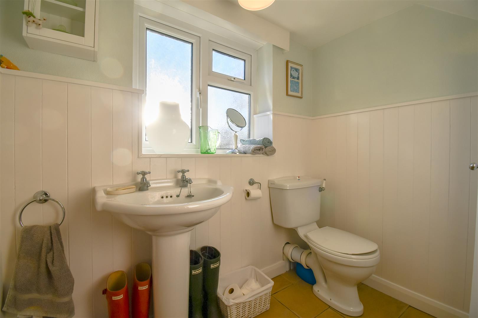 Papered ceiling and walls with traditional timber cladding surrounding. Tiled flooring. Storage cupboard. Close coupled toilet, pedestal wash basin with twin taps. UPVC double glazed obscured glass window overlooking the rear elevation.