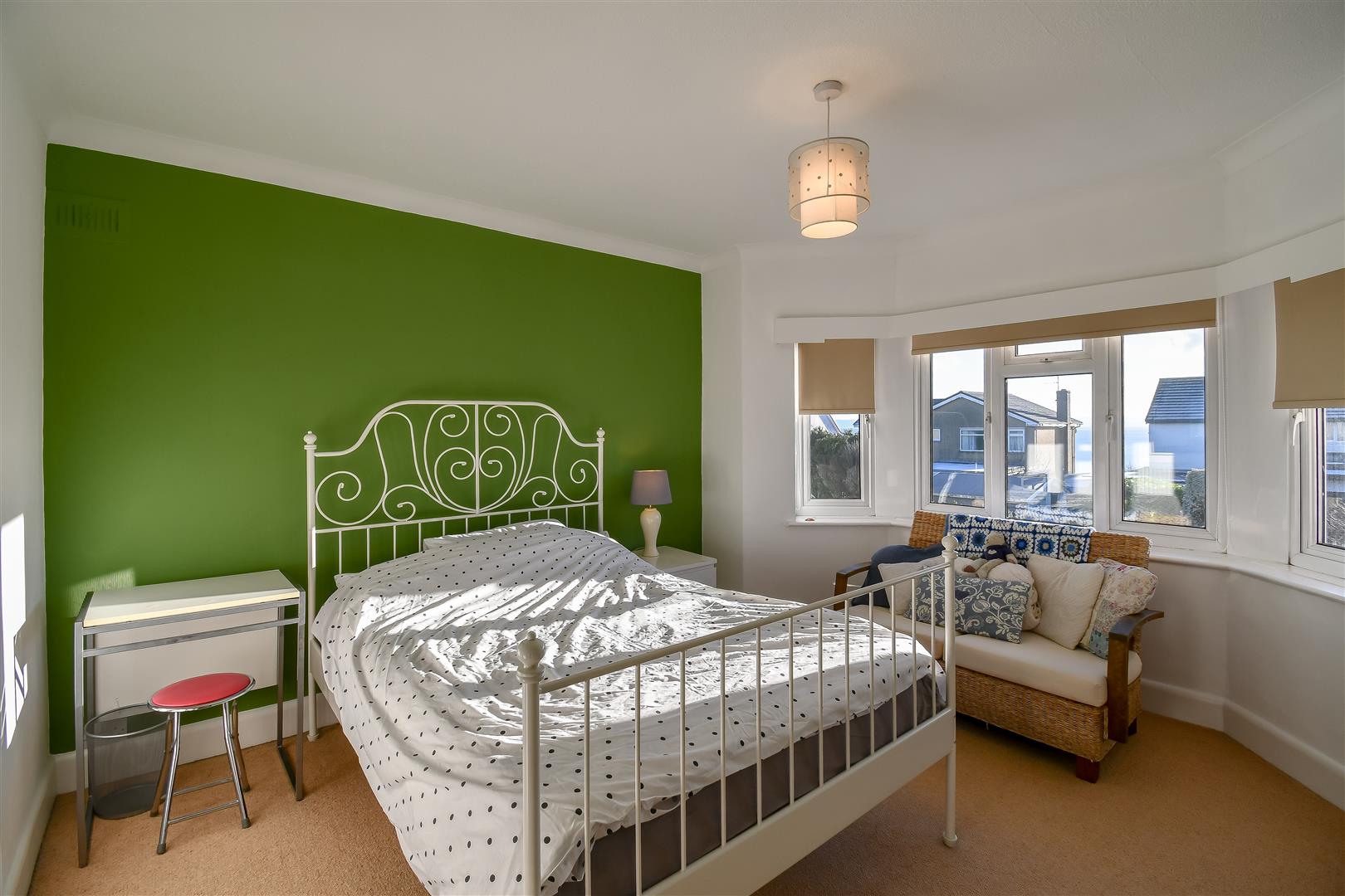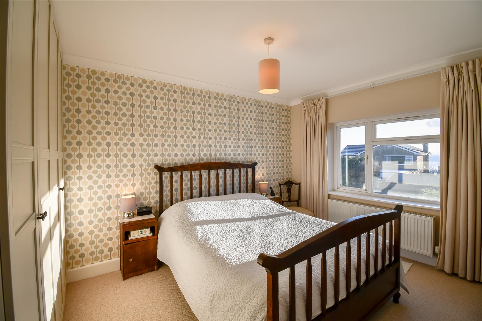 Papered ceiling with coving, papered walls, fitted carpet flooring, UPVC double glazed bay windows overlooking the rear elevation with sea views across the Bristol Channel and beyond. Wall mounted radiator.