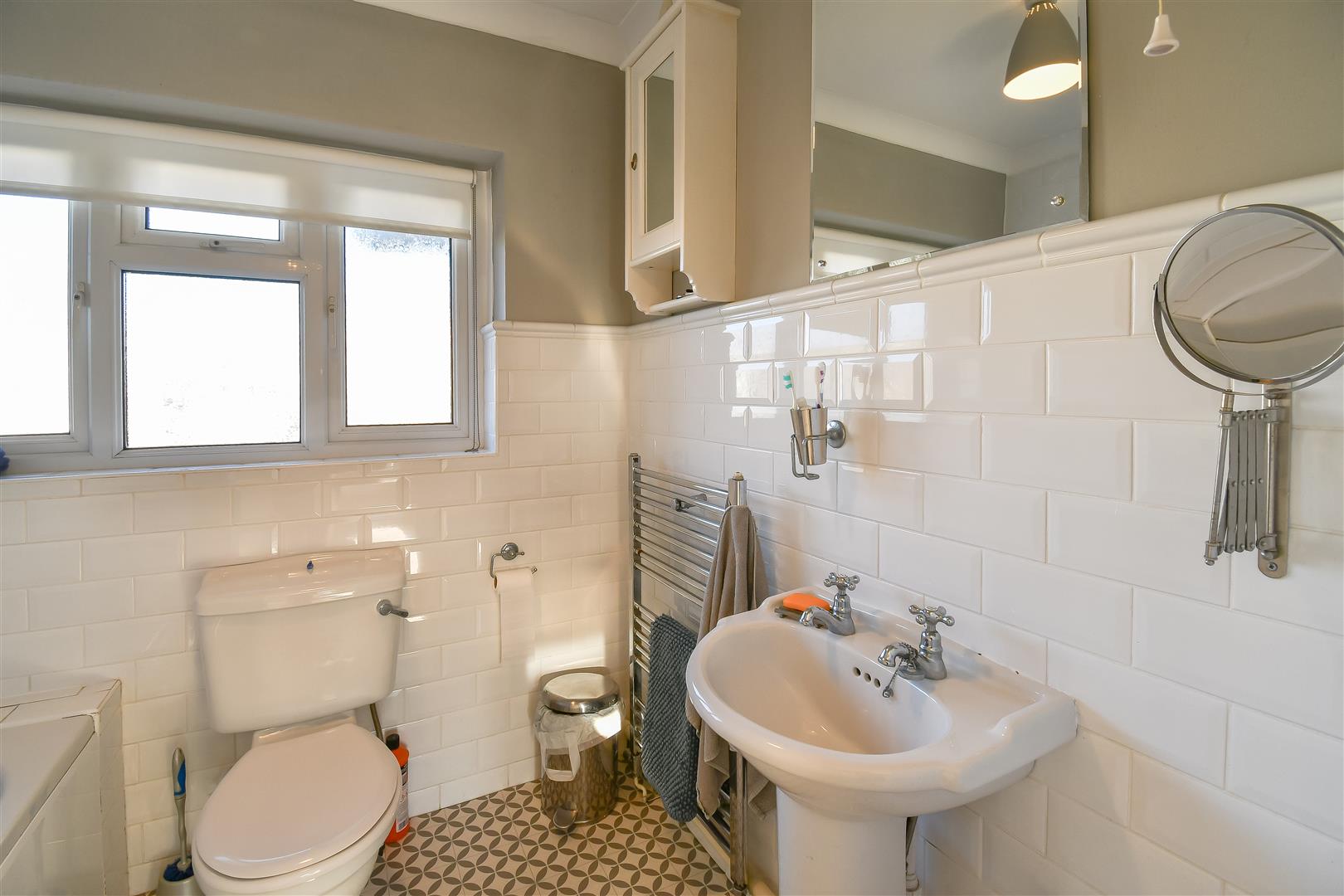 Plastered ceiling with coving, plastered walls and traditional Metro style tiles, vinyl flooring, close coupled toilet, bath with Victorian style mixer tap. Shower attachment over. Pedestal wash hand basin twin taps over. Vertical towel rail heater. UPVC double glazed window obscured glass overlooking the front elevation.