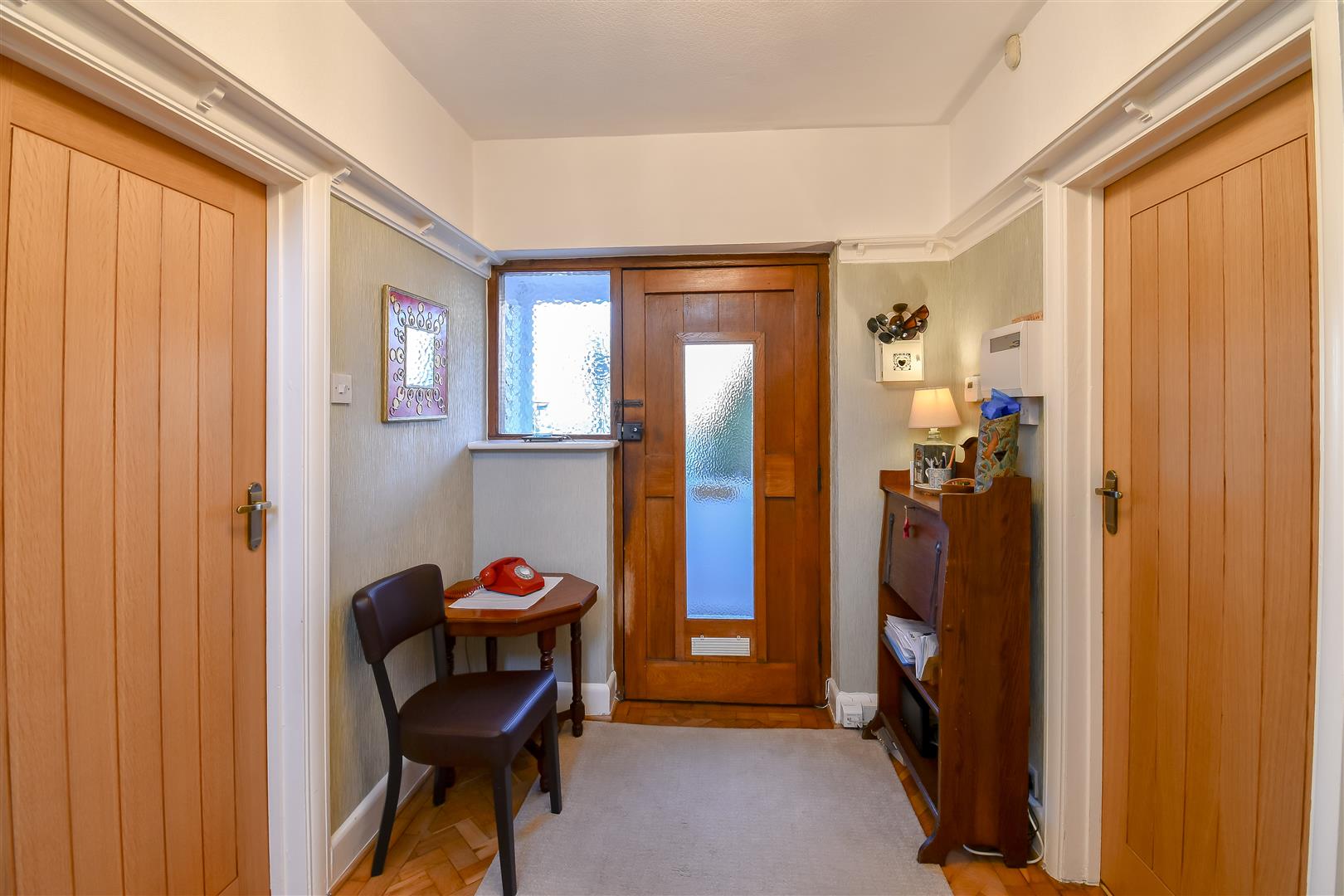 Papered ceiling and paper walls with traditional picture rails. Original parquet flooring, fitted carpet stairs rising to the first floor. Wooden oak doors opening to the living room, study and dining room, further door opening to the WC cloakroom. Wall mounted radiator.