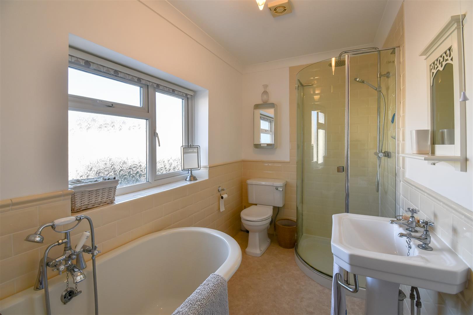 Plastered ceiling with coving, plastered walls with traditional metro ceramic tiles, vinyl flooring, freestanding bath with decorative cast iron legs. Victorian style mixer tap and shower attachment over. Wall mounted towel rail heater. Victorian pedestal wash basin with twin taps, close coupled toilet, shower cubicle with sliding glass shower screen and mains operating shower over. Extractor fan.