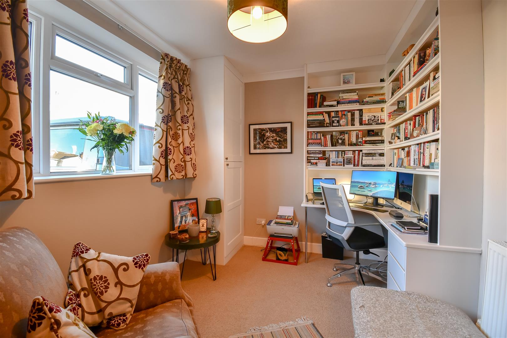 Papered ceiling with coving, plastered walls, fitted carpet flooring, fitted storage cupboard housing a combination wall mounted boiler. UPVC double glazed window to the front aspect. Fitted shelving units and desk. Wall mounted radiator.